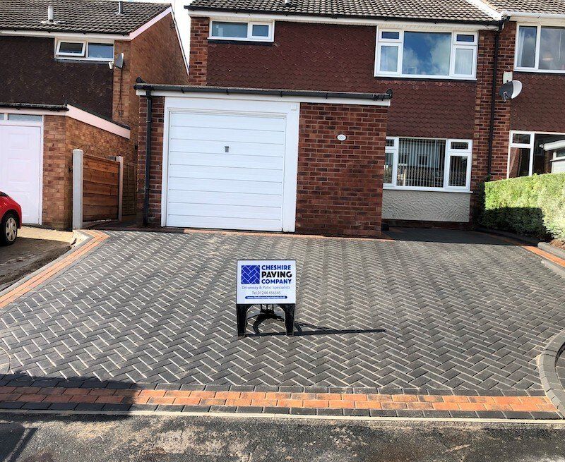 BELOW: A Car Park / Driveway Project Completed In Northwich Cheshire. The Car Park & Pathways Are Finished In Tobermore Pedesta Block Paving In The Colour Of Slate With Charcoal Treble Borders. Full Dig Out, New MOT Type 1 Sub Base With Geo Textile Membrane, Recess Manhole Covers, Drainage Channels & Kerbs.
