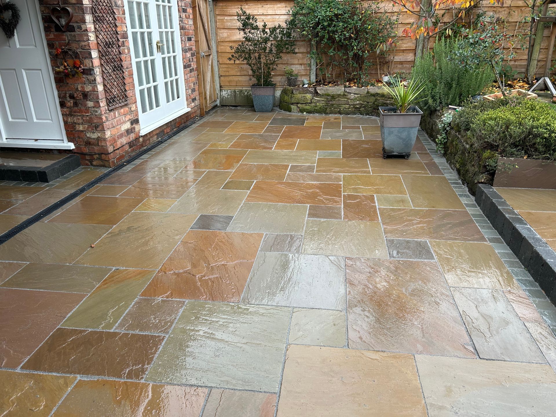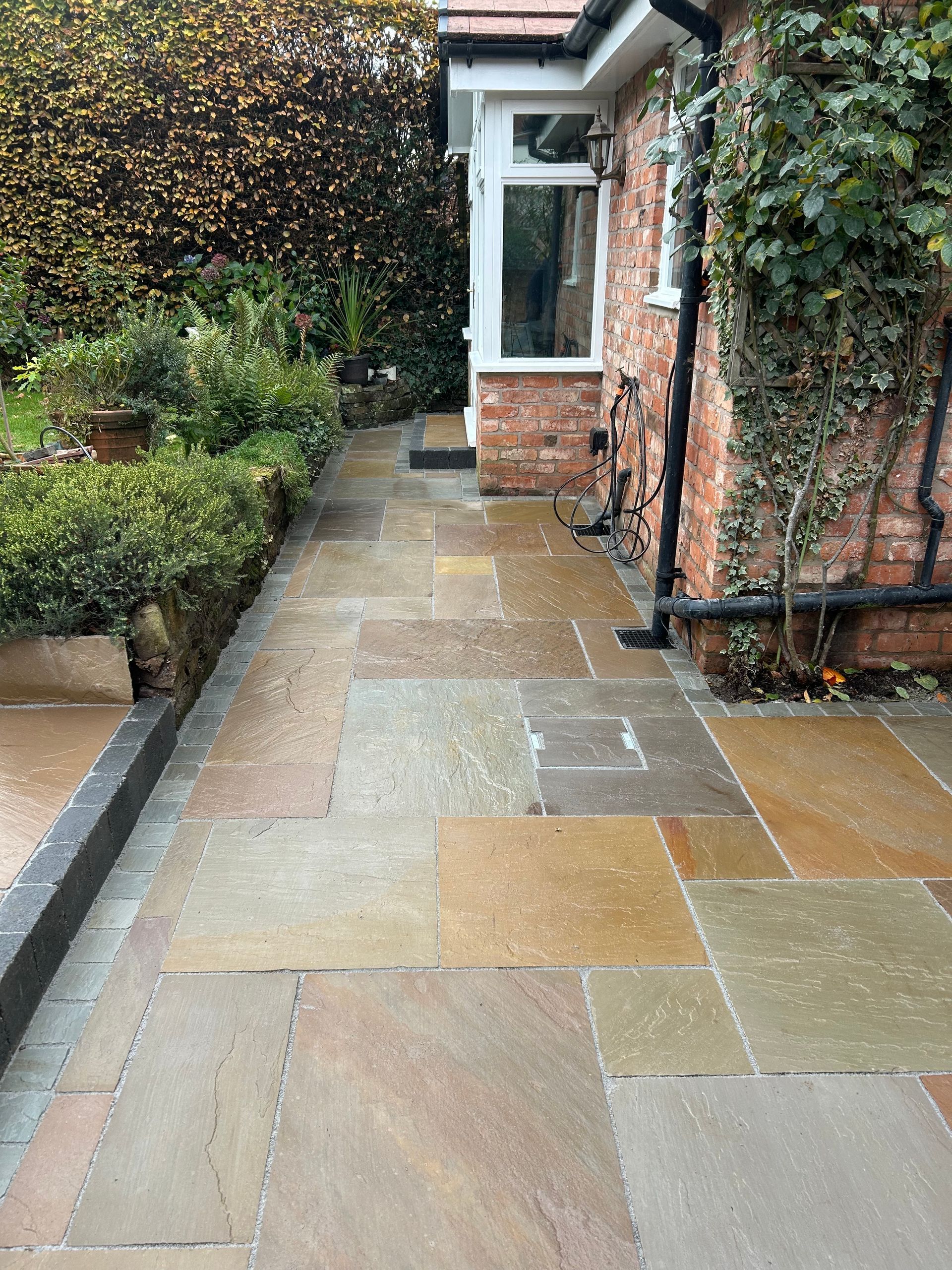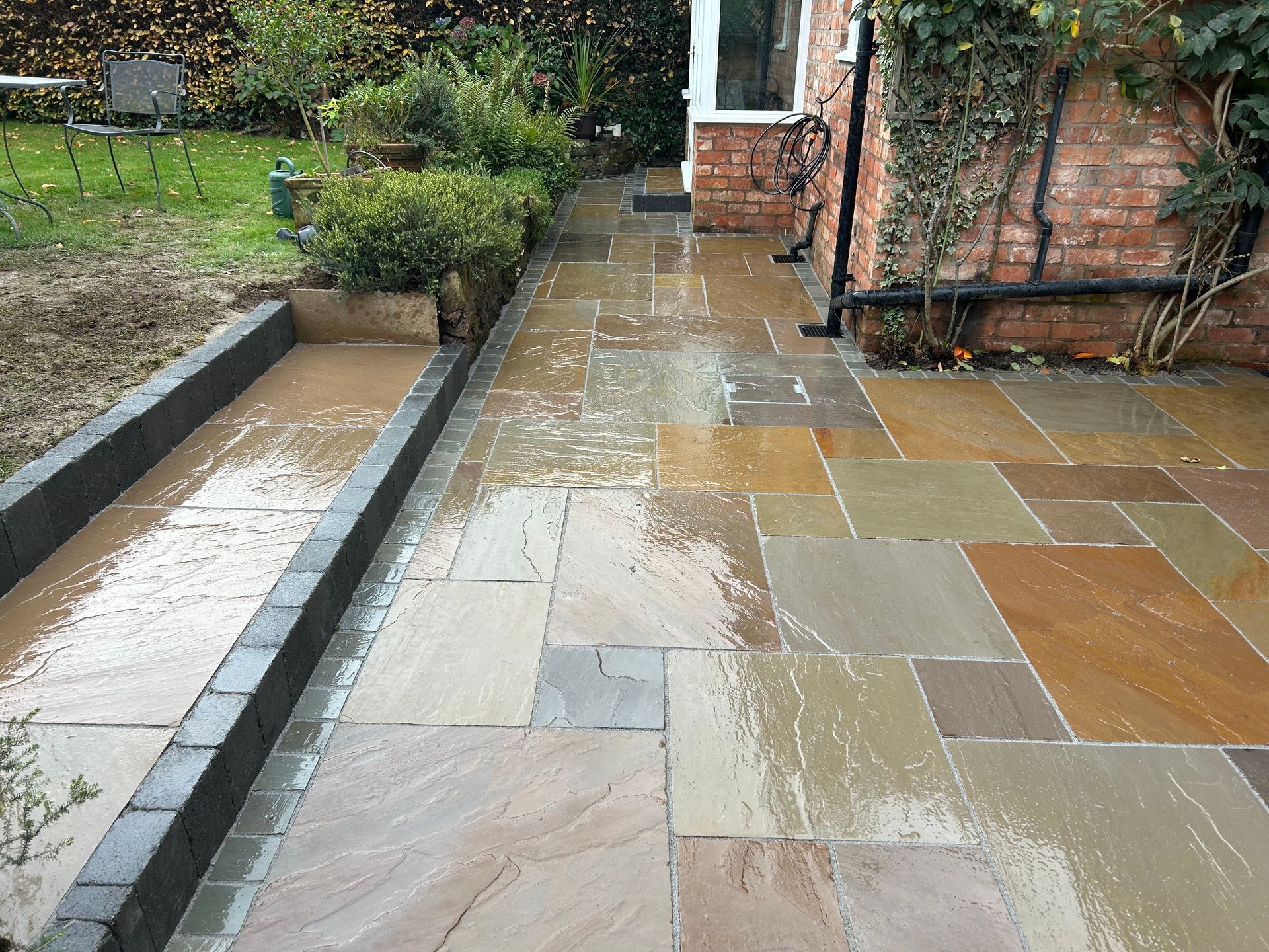 BELOW: New Patio Completed In Handbridge, Chester, Cheshire. Old Decking Removed. Natural Riven Indian Sandstone In Raj Blend With KL Key Kerb Steps & Sleeper Retaining Step installed.
