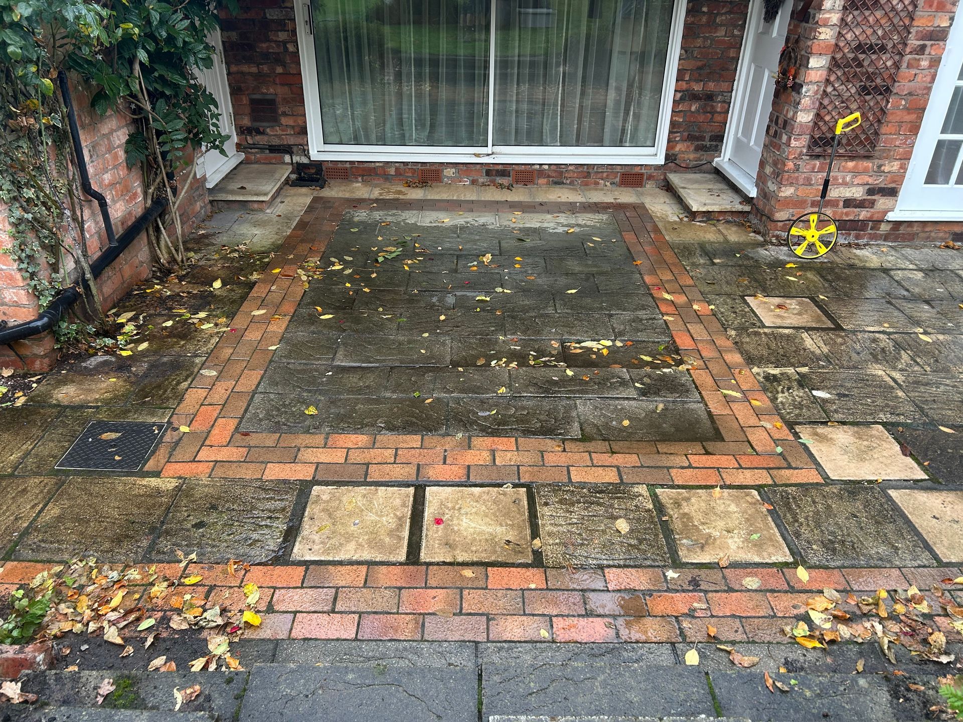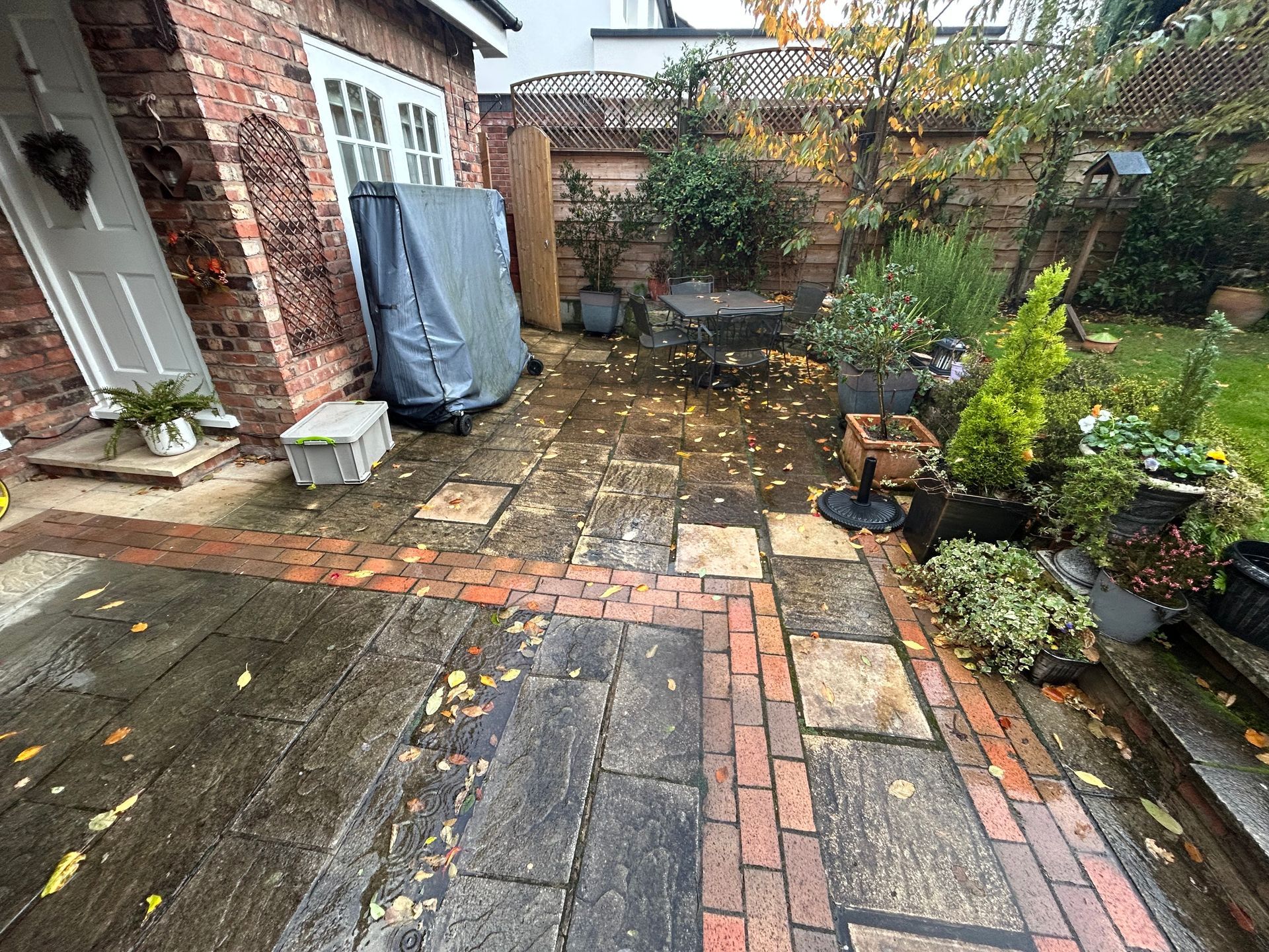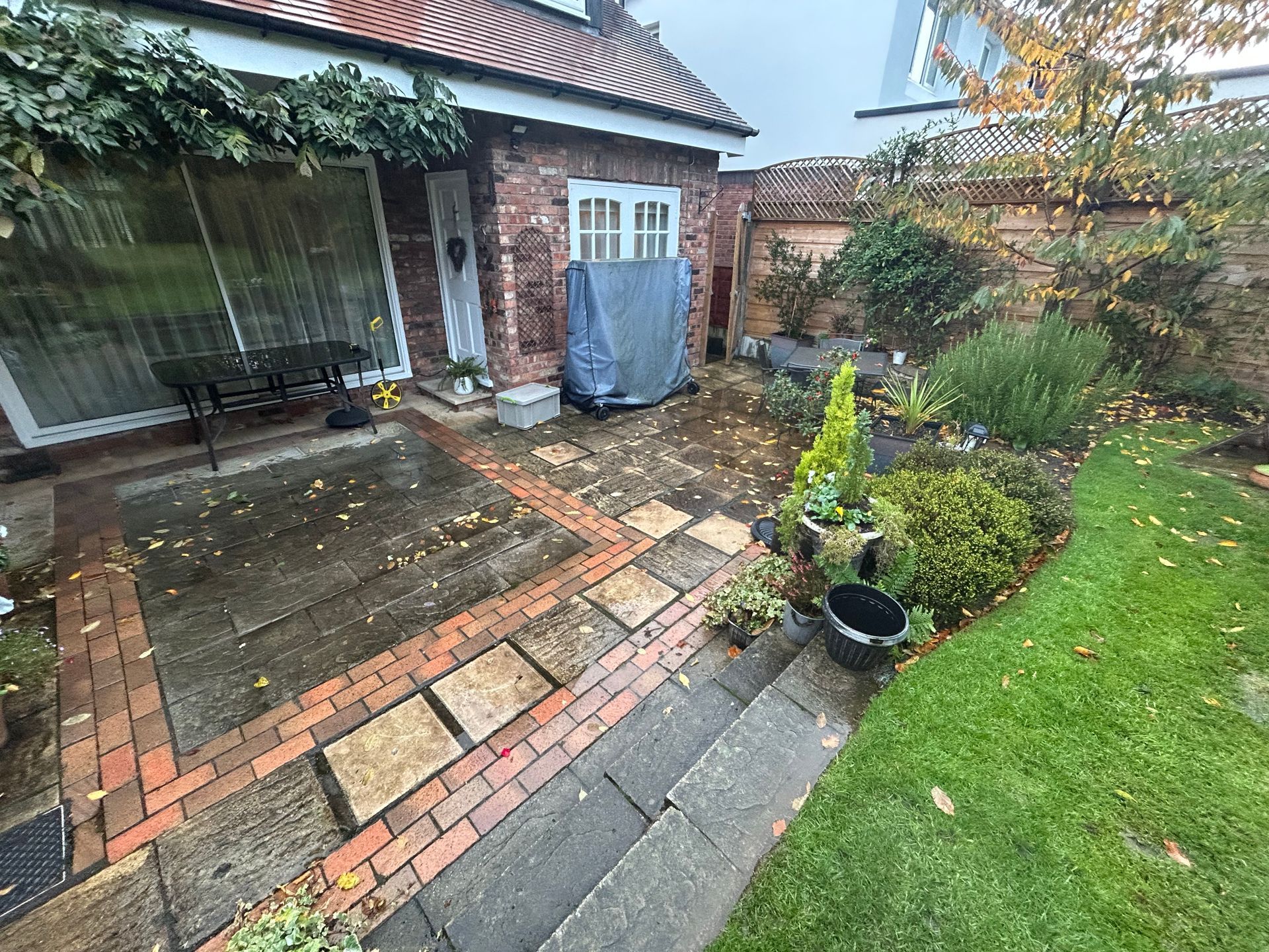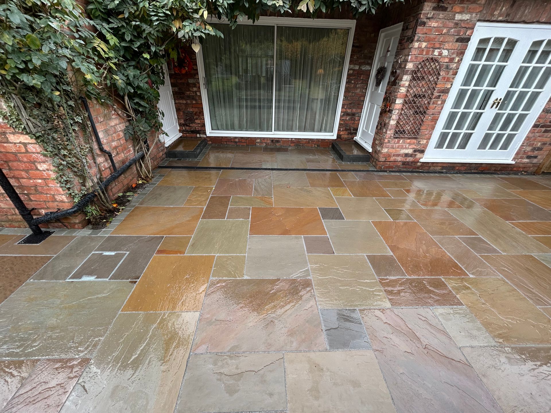 BELOW: New Patio Completed In Handbridge, Chester, Cheshire. Old Decking Removed. Natural Riven Indian Sandstone In Raj Blend With KL Key Kerb Steps & Sleeper Retaining Step installed.