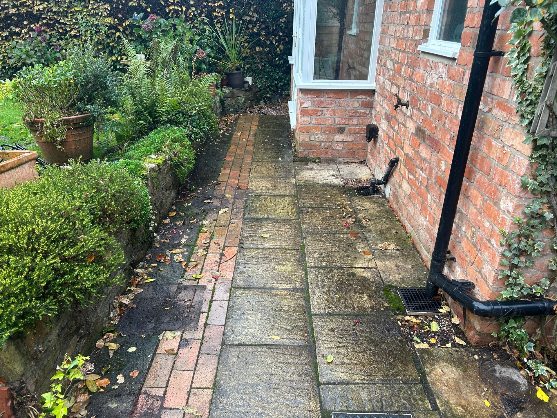 BELOW: A patio project in Ellesmere Port, Cheshire. The old patio has been replaced with natural riven Indian sandstone paving in Kandla grey and Indian stone pathways around a newly turfed lawn. The project involved a new fence along the back of the garden, a full dig out, new MOT Type sub base, recess manhole covers drainage channels and a new step.