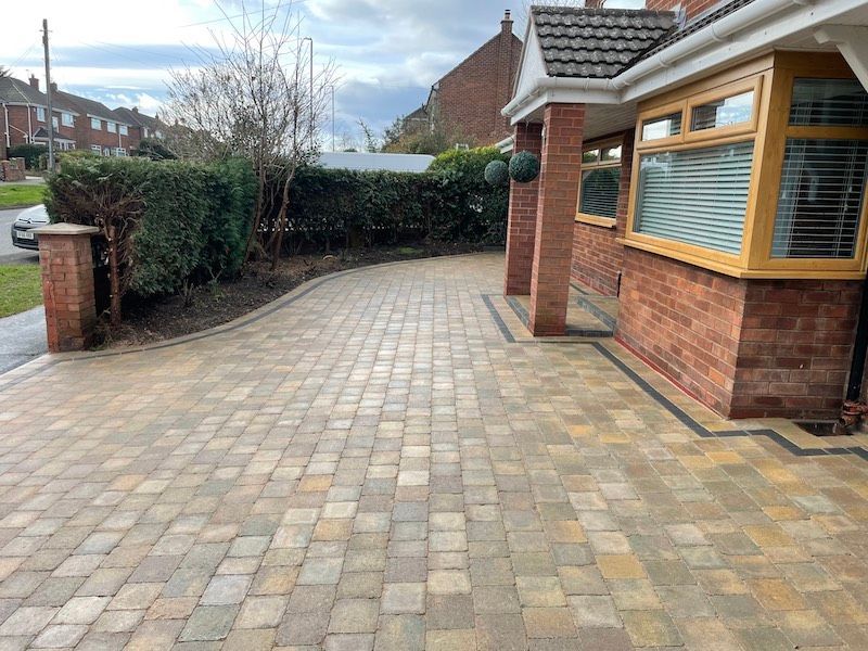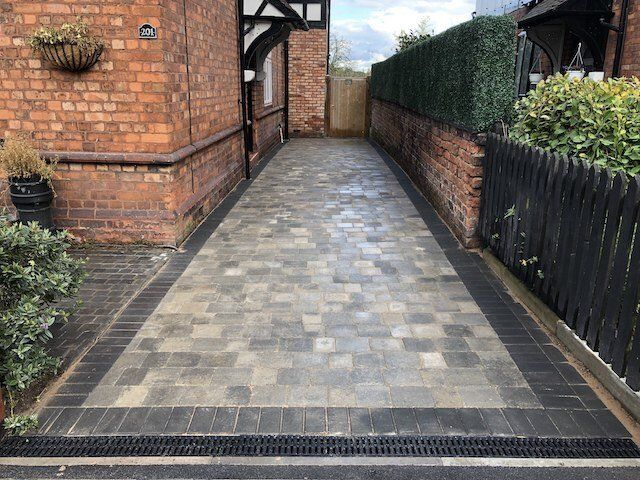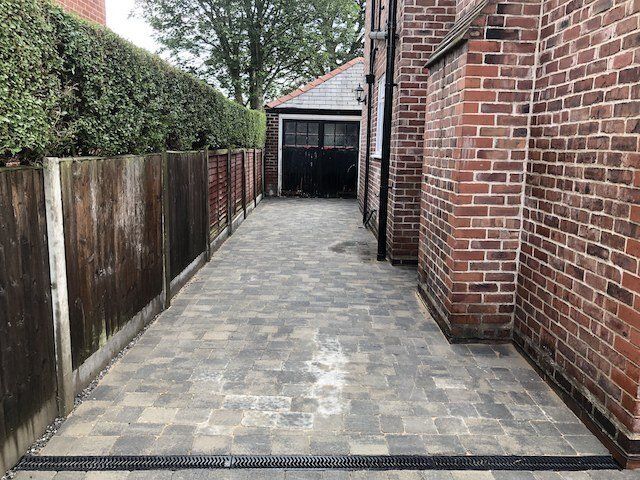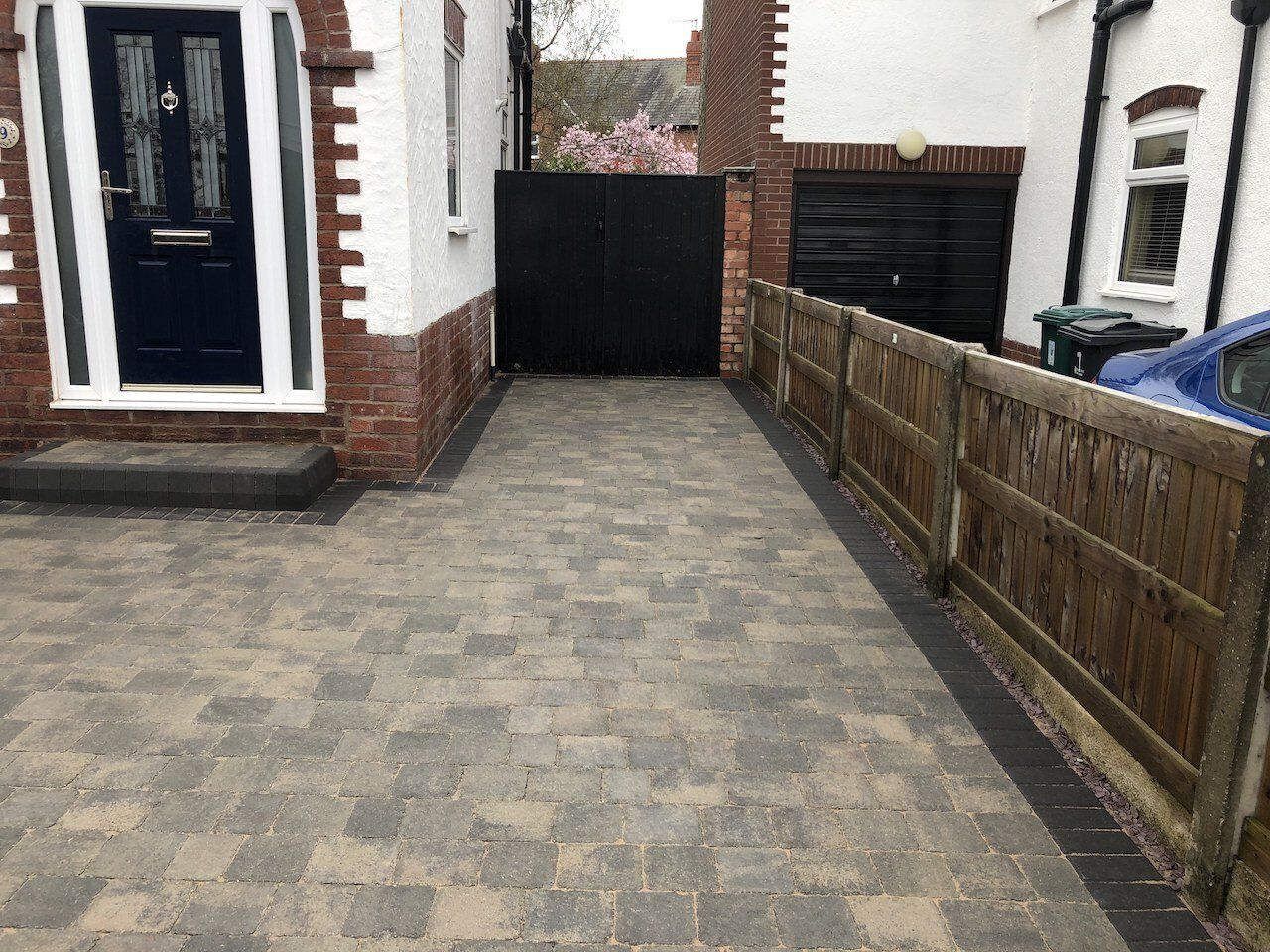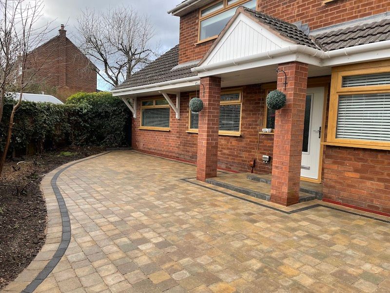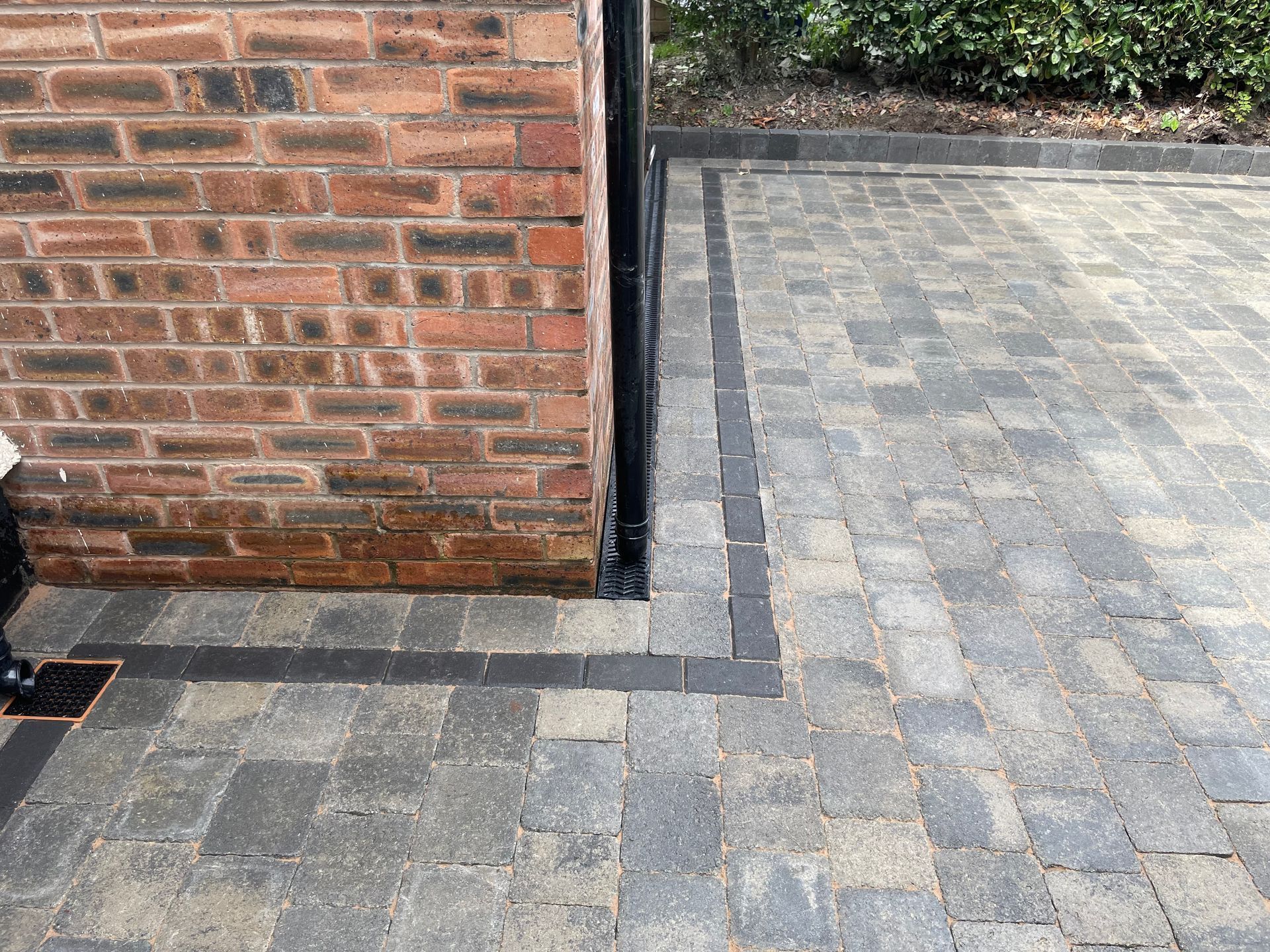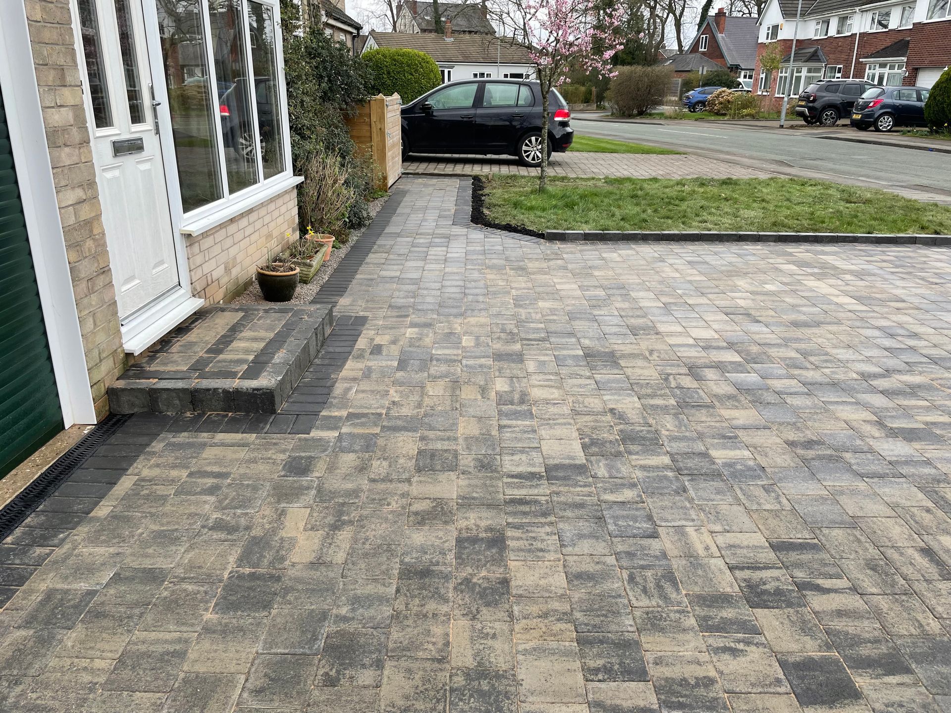 BELOW: A driveway project in Chester, Cheshire. The driveway is finished in heather coloured Tobermore Shannon block paving with a golden Pedesta inlaid border. The project required a full dig out, new MOT Type 1 sub base with Geo Textile membrane, drain gulleys, recess manhole covers, drainage channels and a new step.