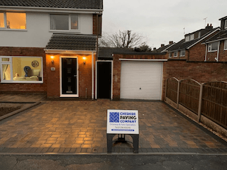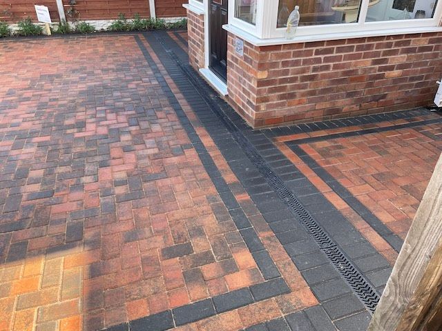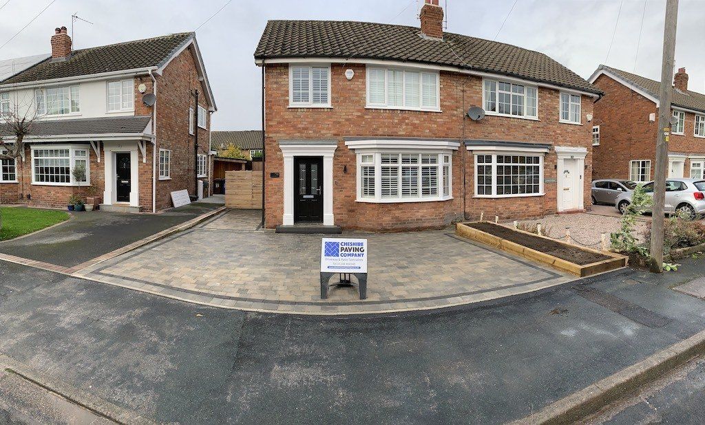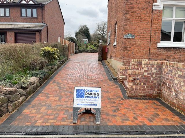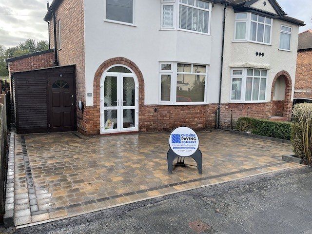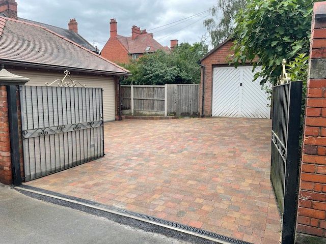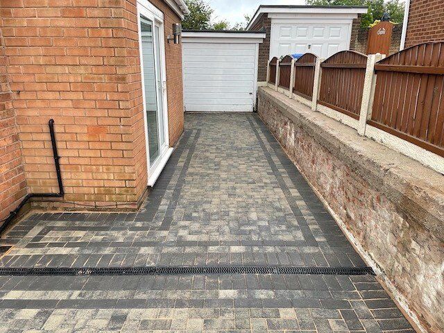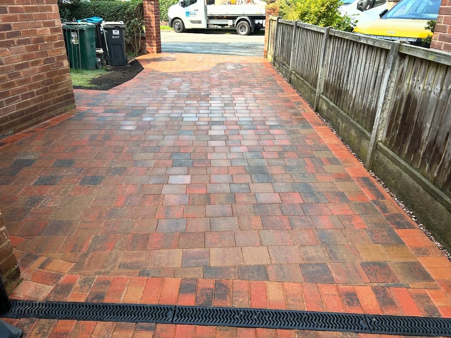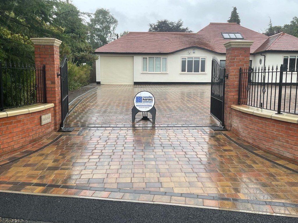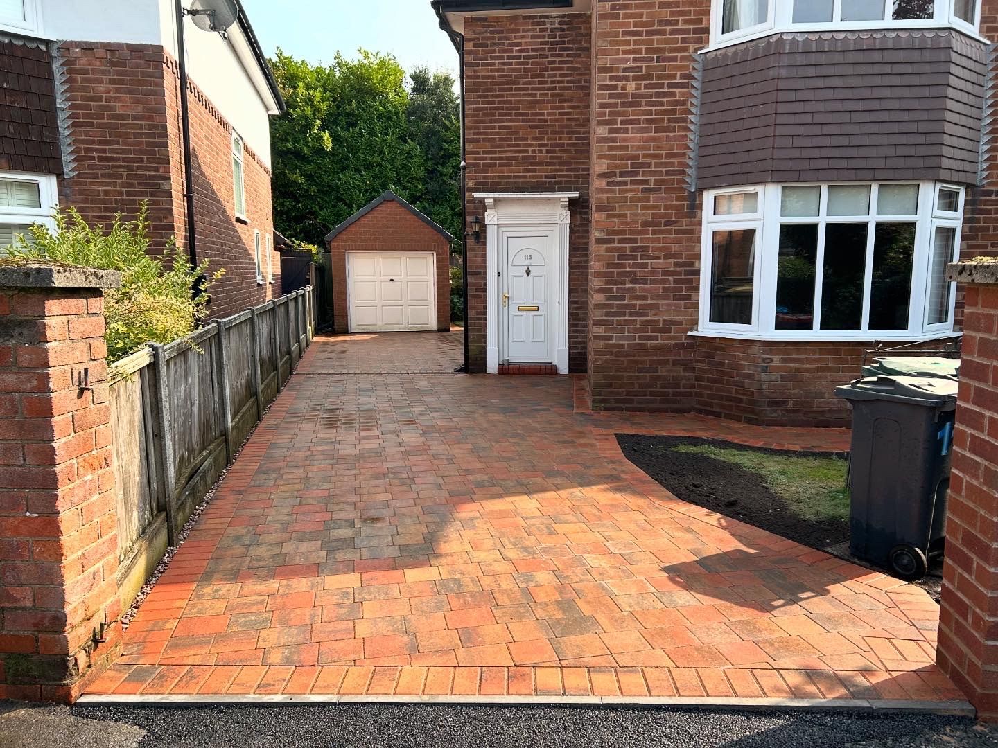 BELOW: A driveway project in Chester, Cheshire. The driveway is finished in heather coloured Tobermore Shannon block paving with a golden Pedesta inlaid border. The project required a full dig out, new MOT Type 1 sub base with Geo Textile membrane, drain gulleys, recess manhole covers, drainage channels and a new step.