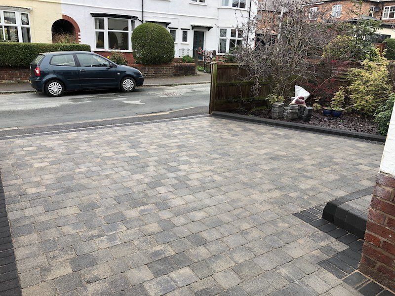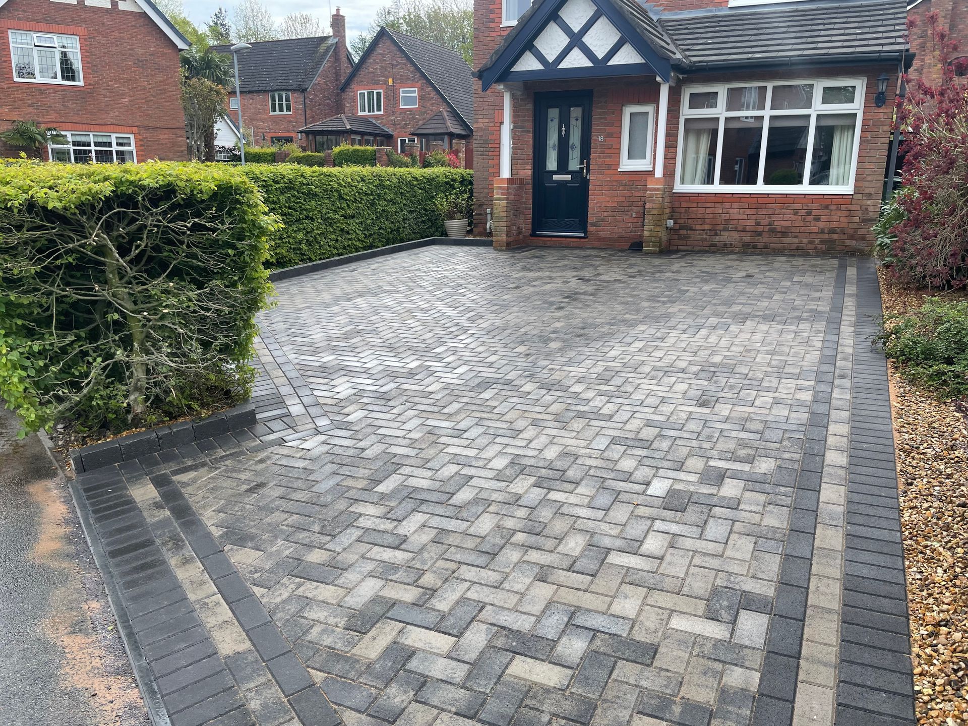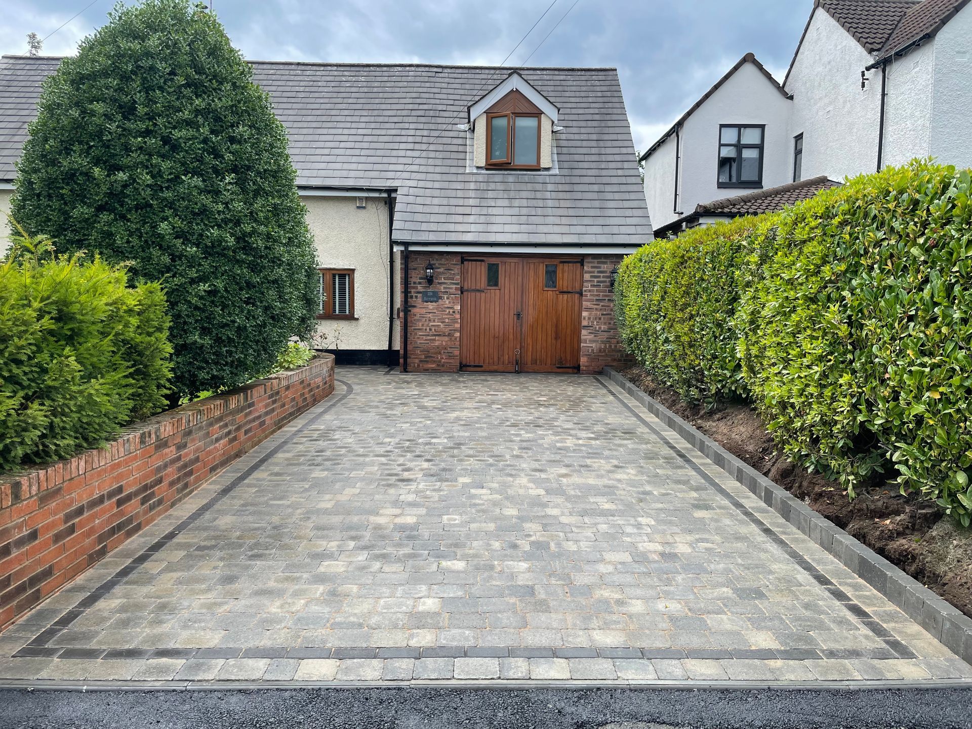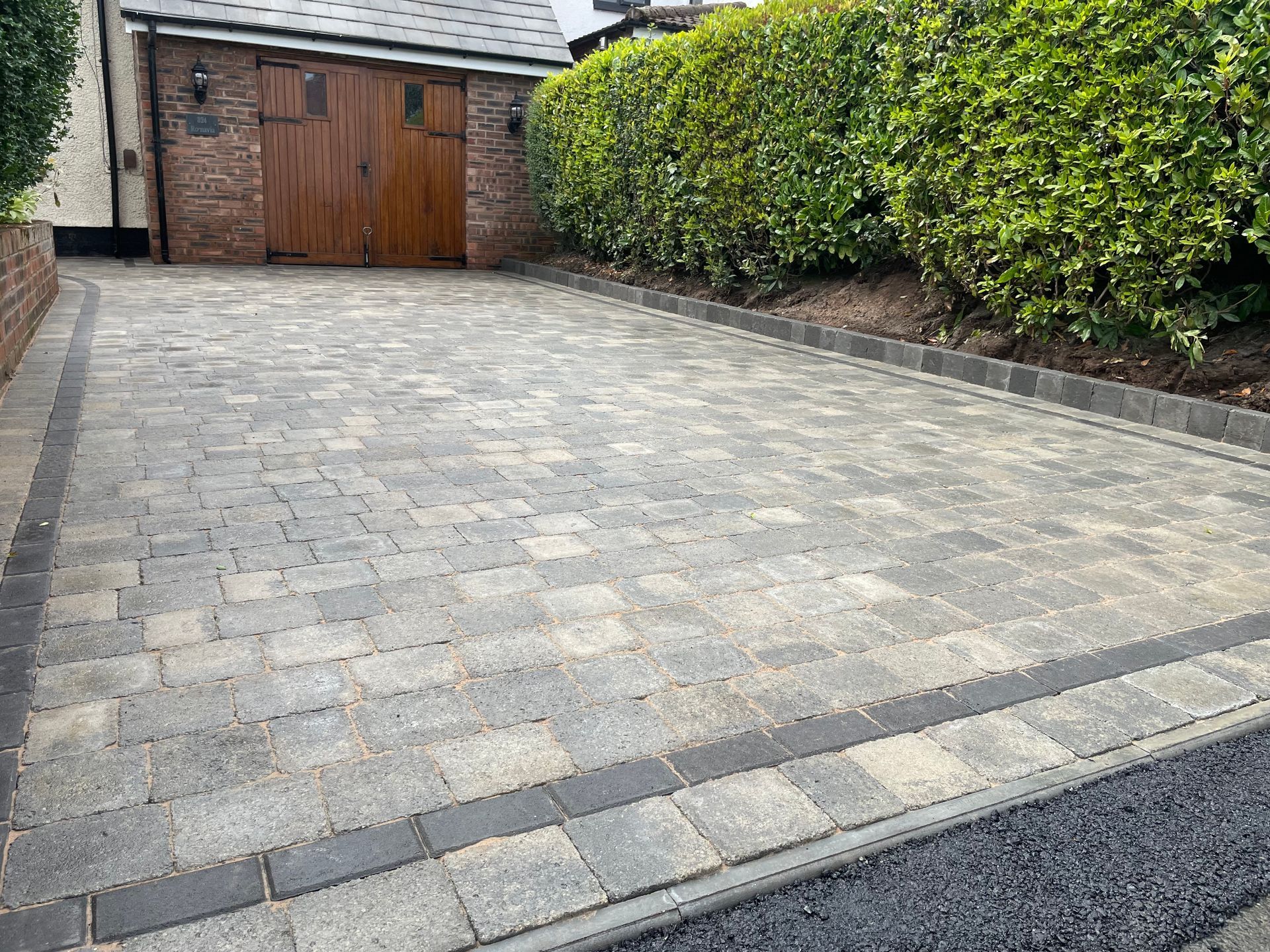 BELOW: Driveway project completed in Hoole, Chester. This driveway was finished in slate coloured Tobermore Tegula block paving with a brindle Tegula inlaid border. The project required a full dig out, new type 1 MOT sub base with Geo Textile membrane, recess manhole covers and new drainage channels.