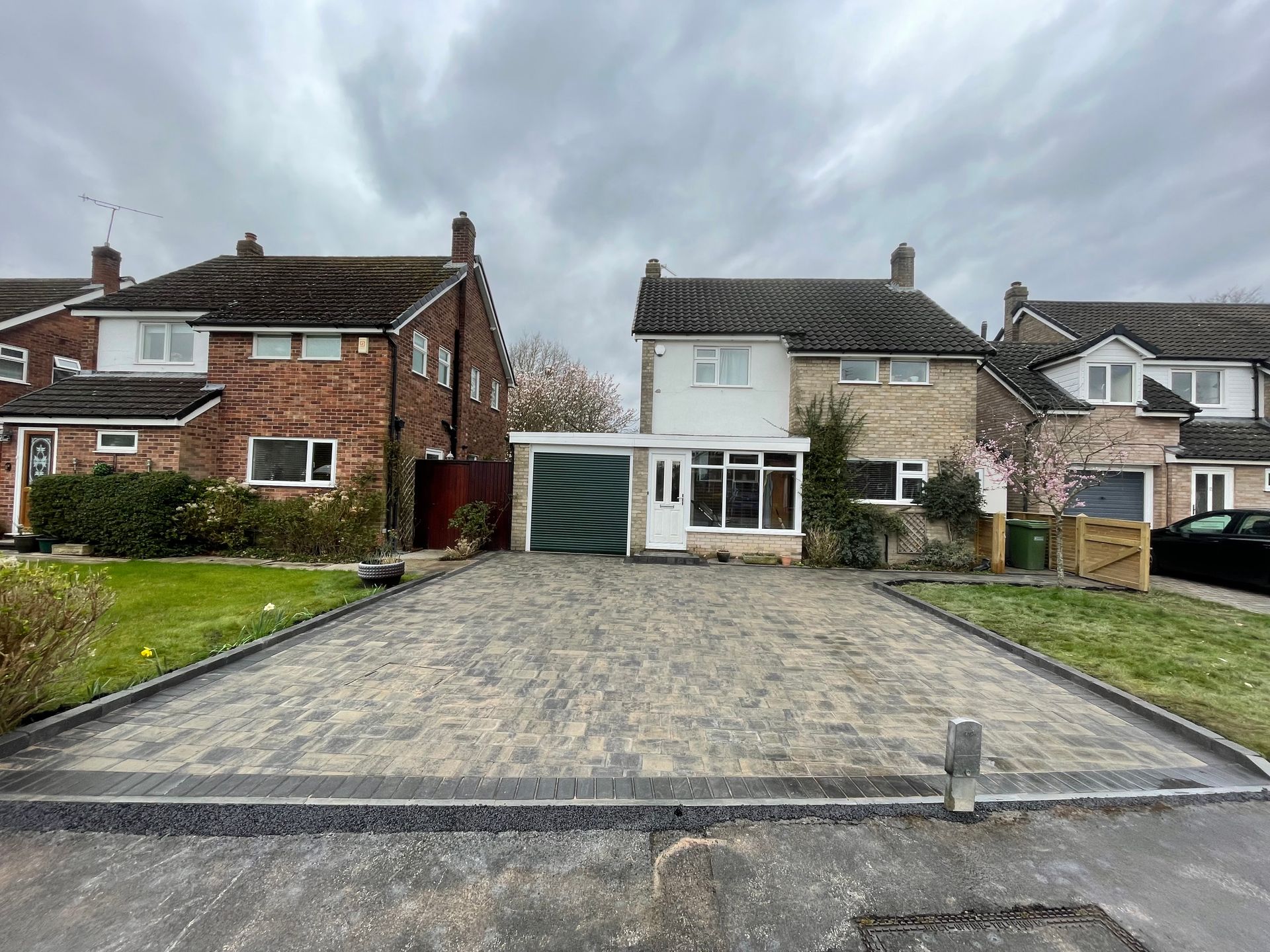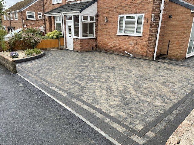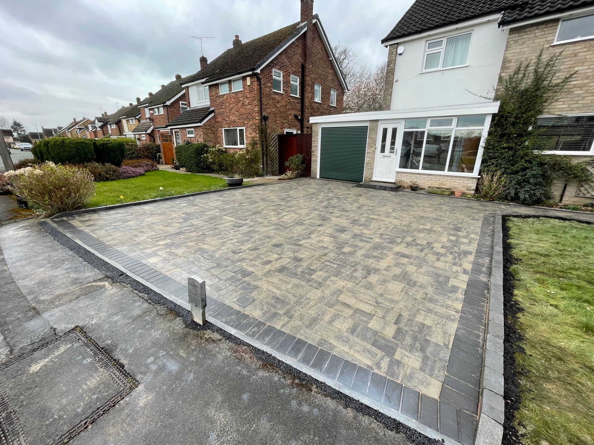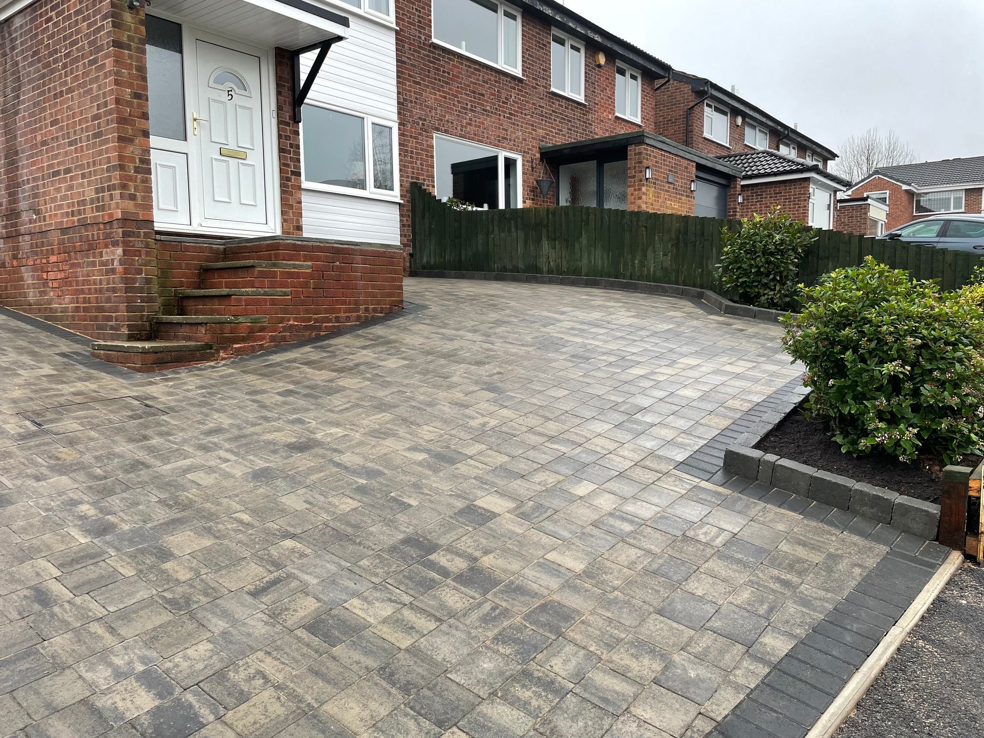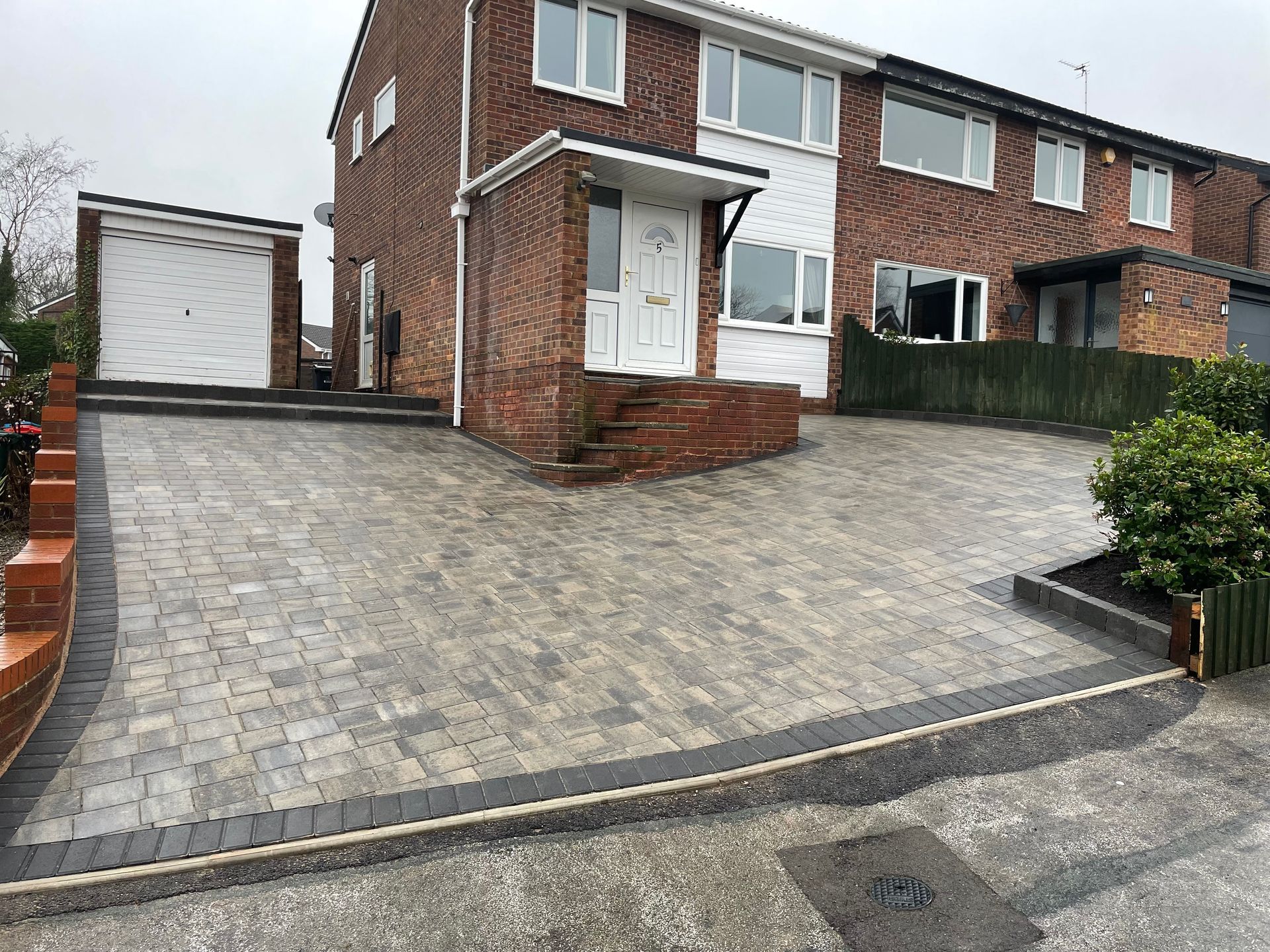 BELOW: Driveway project completed in Hoole, Chester. This driveway was finished in slate coloured Tobermore Tegula block paving with a brindle Tegula inlaid border. The project required a full dig out, new type 1 MOT sub base with Geo Textile membrane, recess manhole covers and new drainage channels.