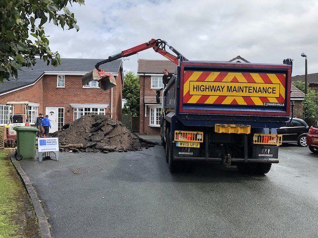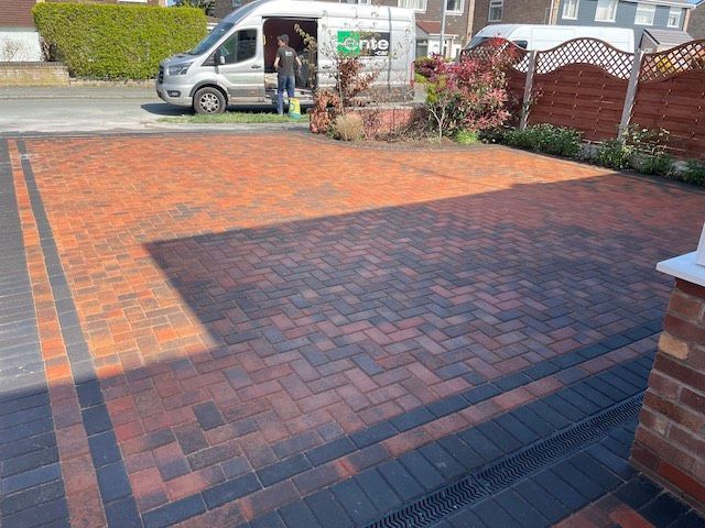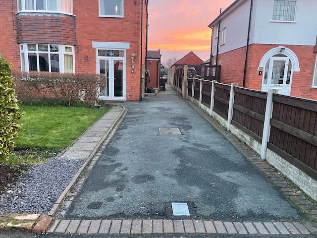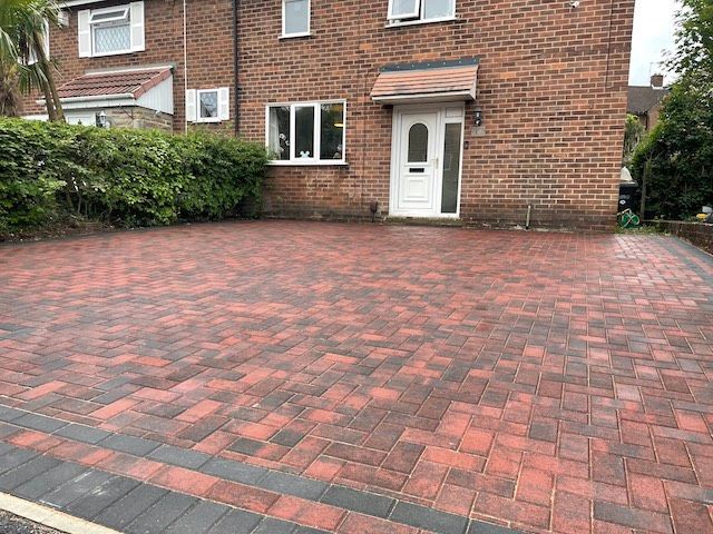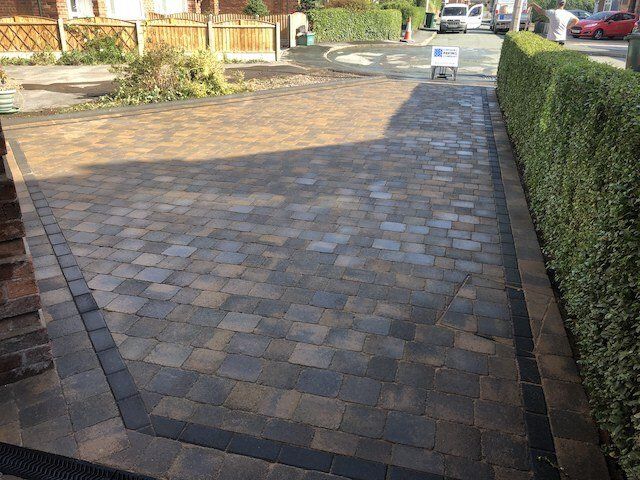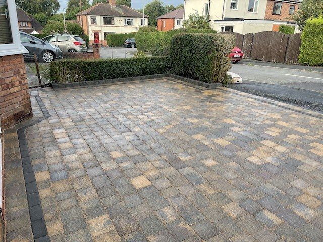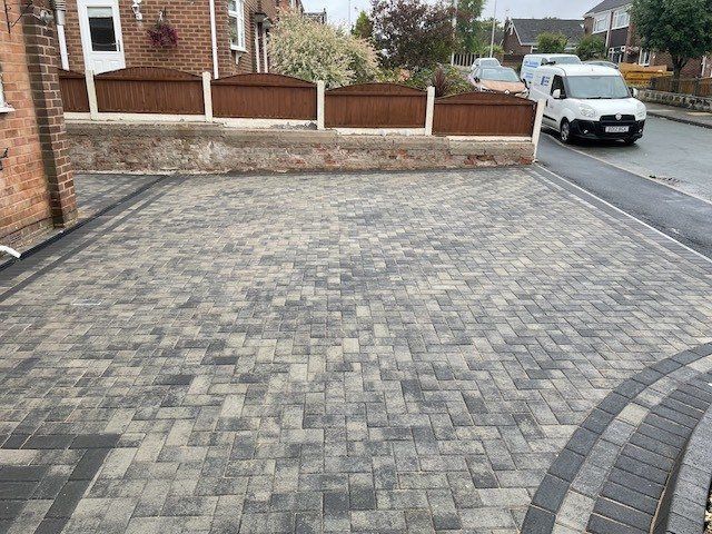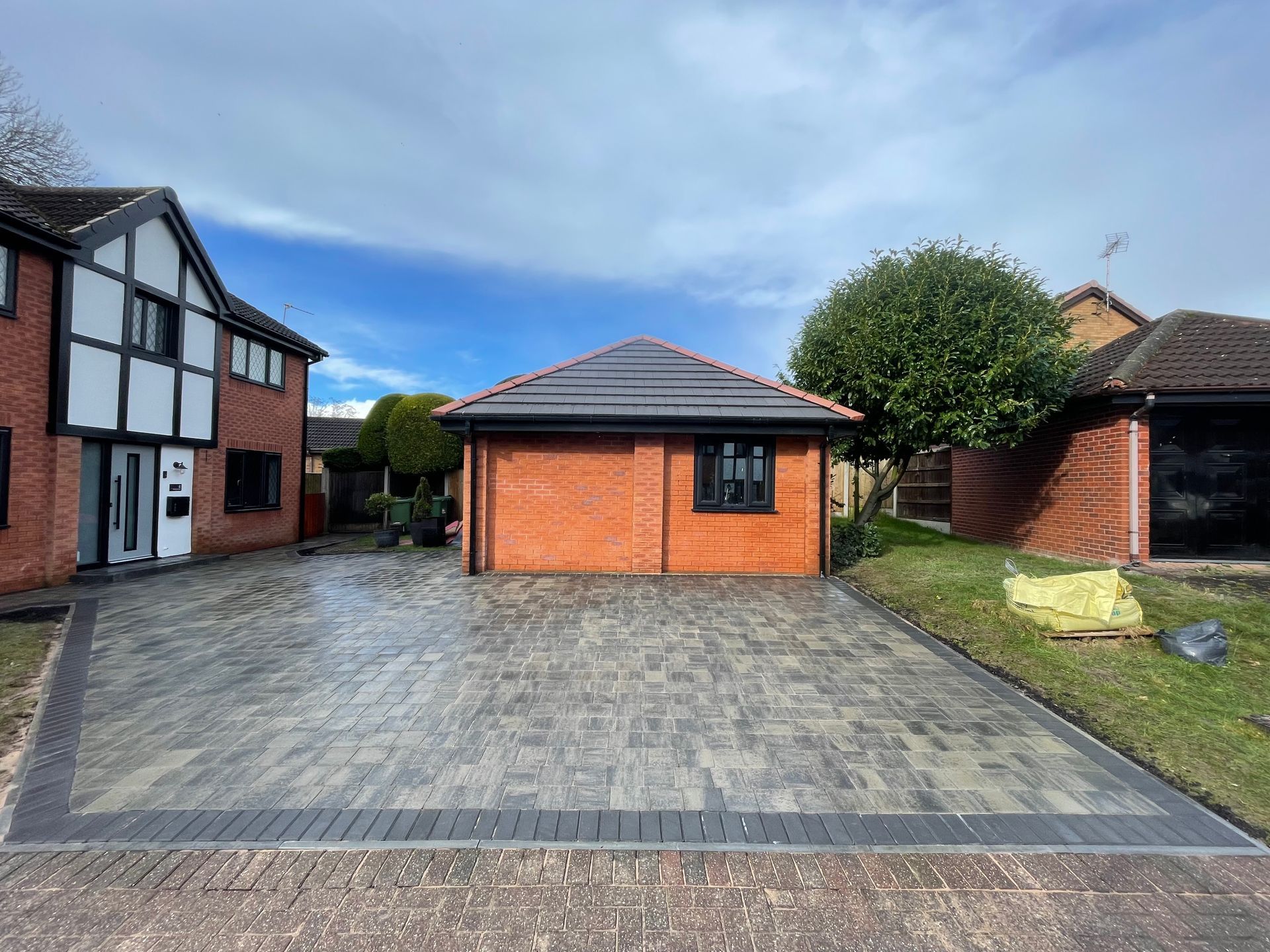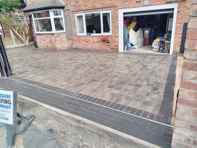 BELOW: Driveway project completed in Hoole, Chester. This driveway was finished in slate coloured Tobermore Tegula block paving with a brindle Tegula inlaid border. The project required a full dig out, new type 1 MOT sub base with Geo Textile membrane, recess manhole covers and new drainage channels.