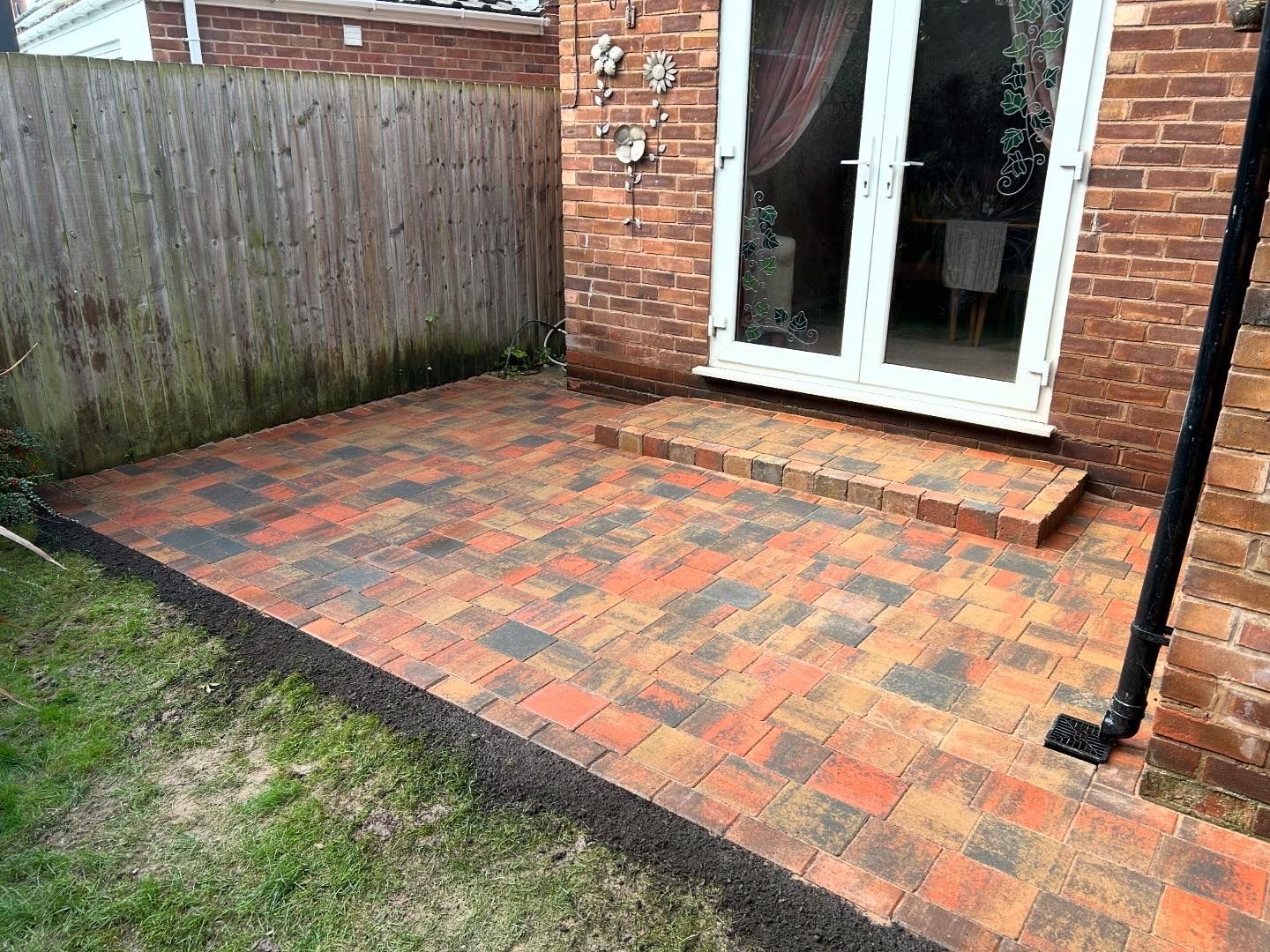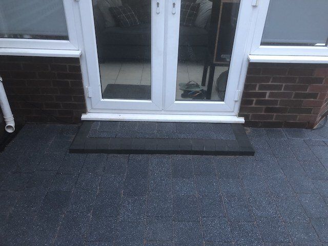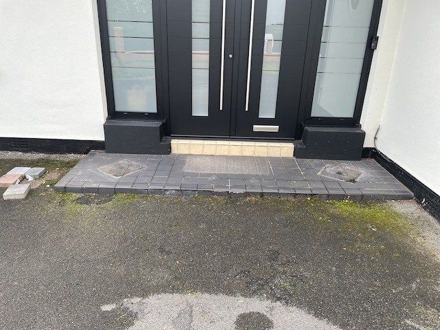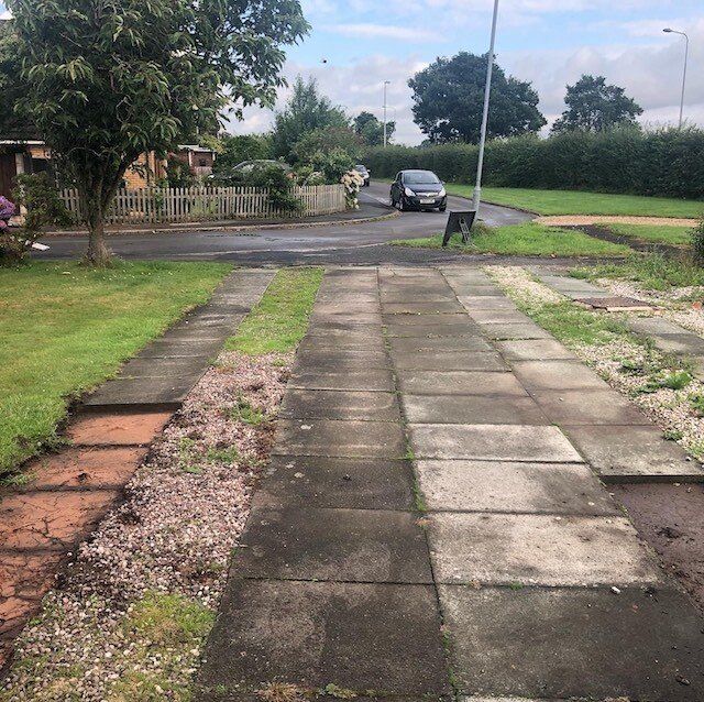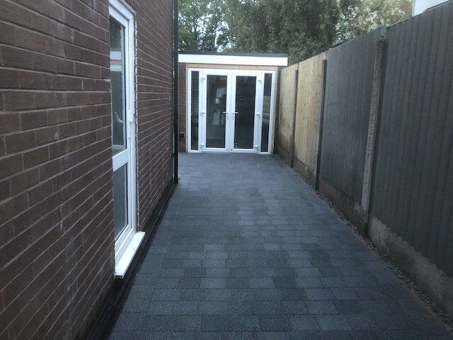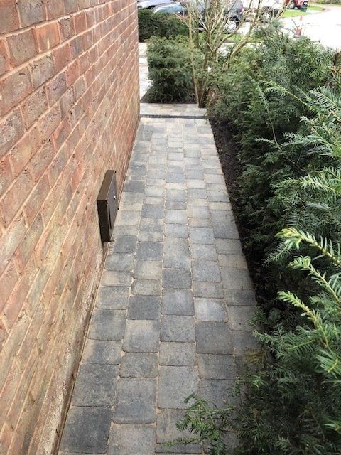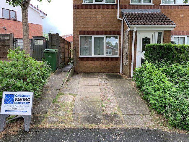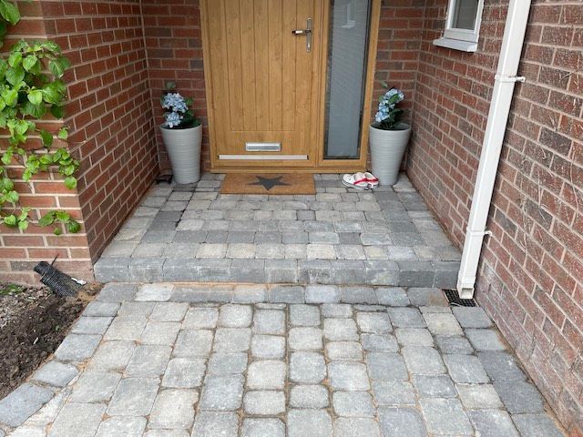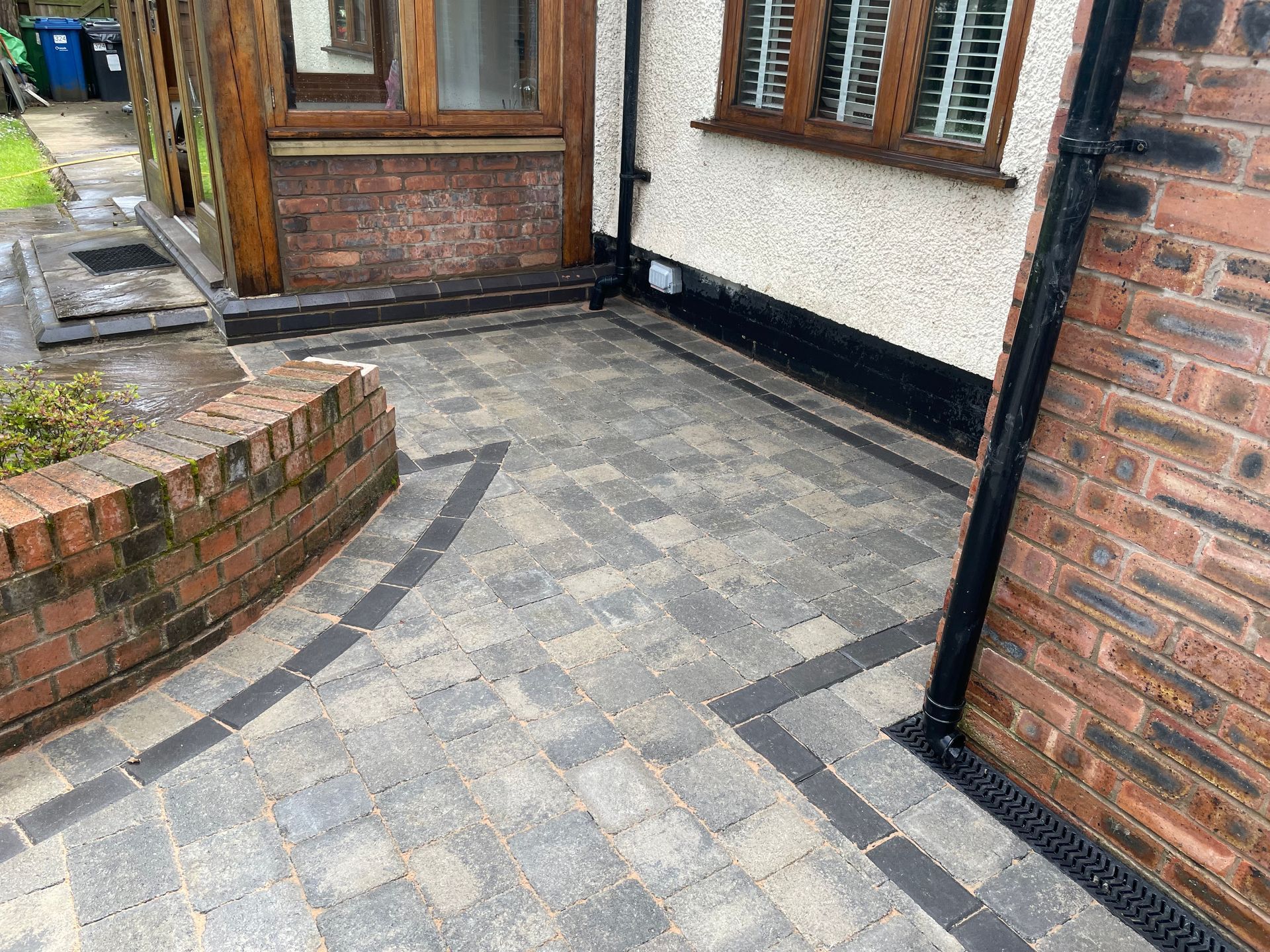BELOW: New driveway and patio project completed in Frodsham, Cheshire. The driveway, patio and pathways have been replaced with Tobermore Shannon block paving in Heather colour with new reconfigured KL kerb steps. Works included full dig out, new sub base with membrane, new drainage system and recessed manhole covers.