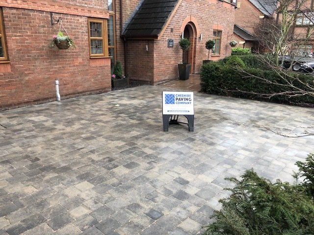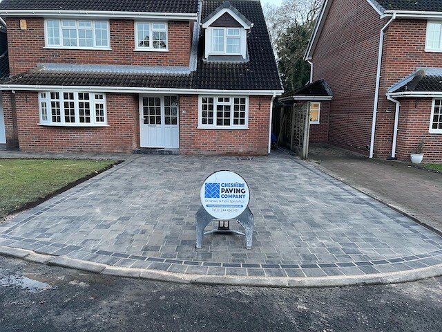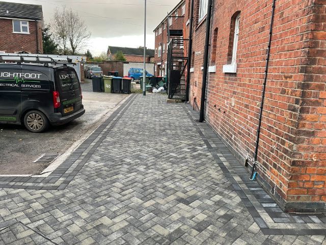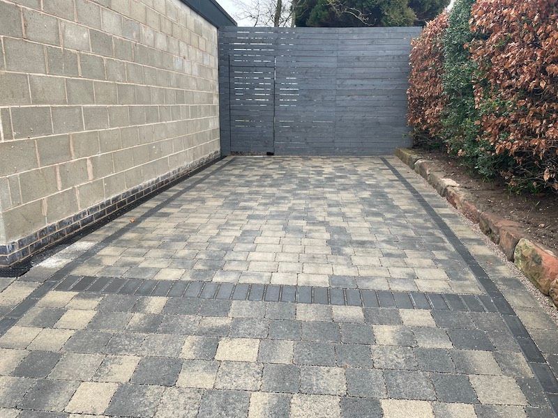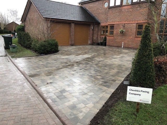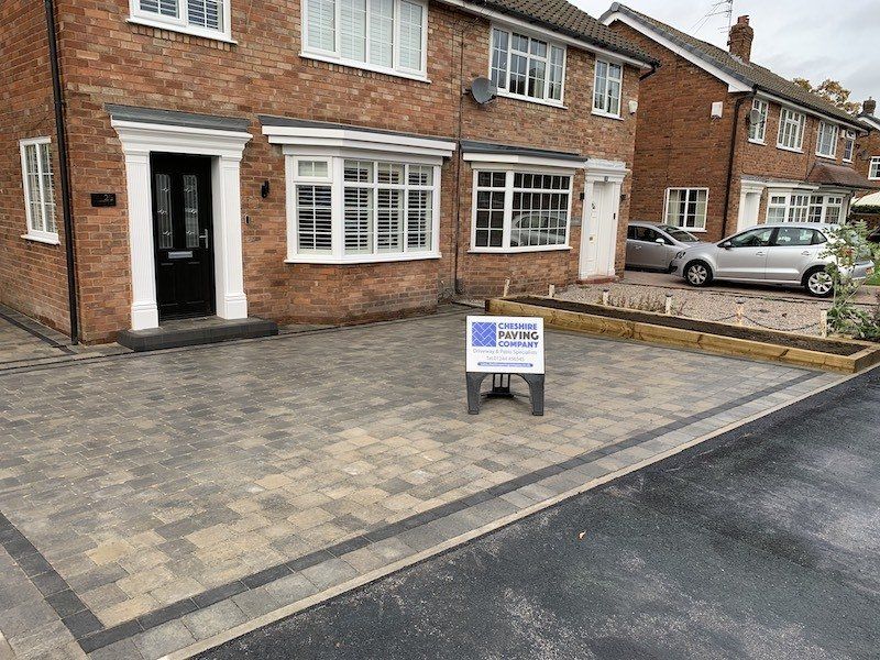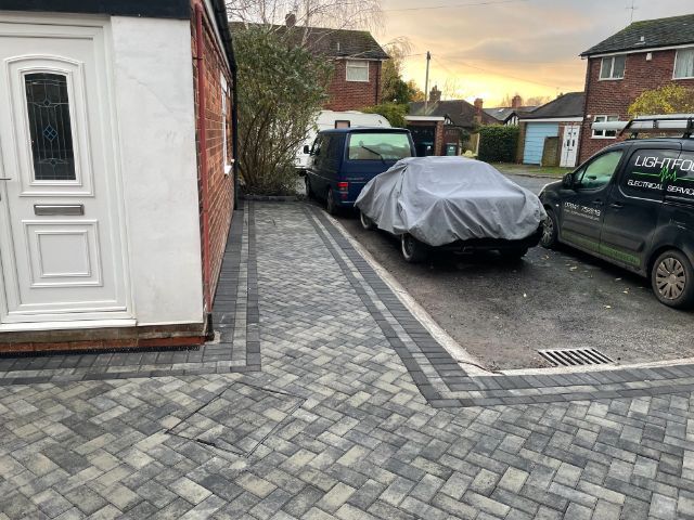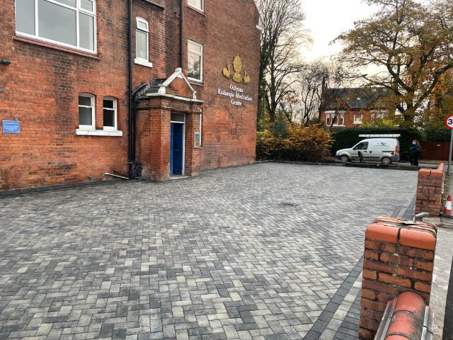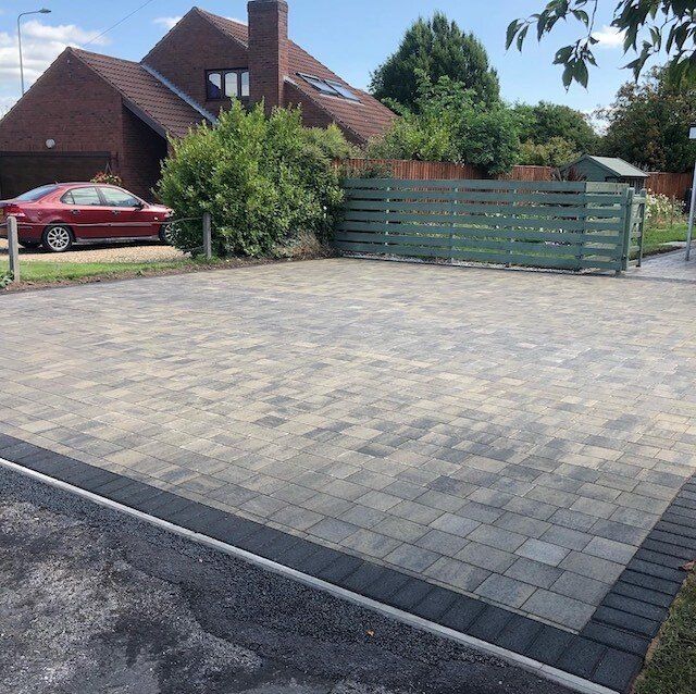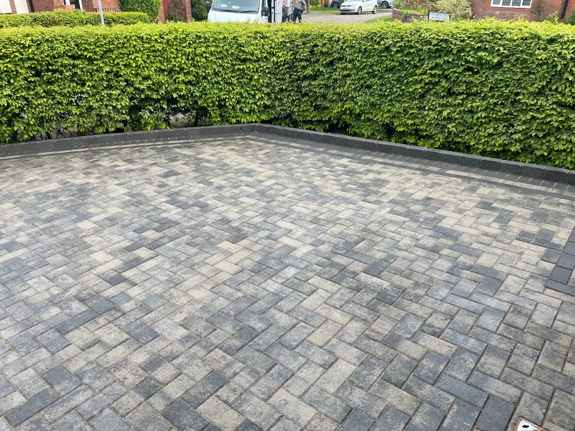 BELOW: A Car Park / Driveway Project Completed In Northwich Cheshire. The Car Park & Pathways Are Finished In Tobermore Pedesta Block Paving In The Colour Of Slate With Charcoal Treble Borders. Full Dig Out, New MOT Type 1 Sub Base With Geo Textile Membrane, Recess Manhole Covers, Drainage Channels & Kerbs.