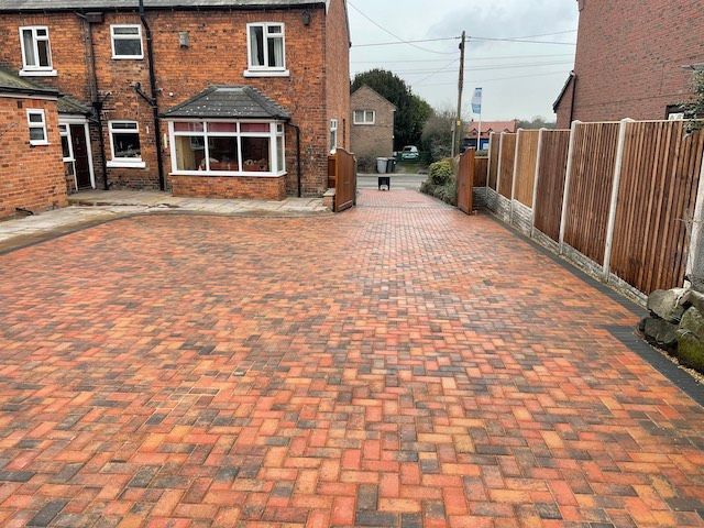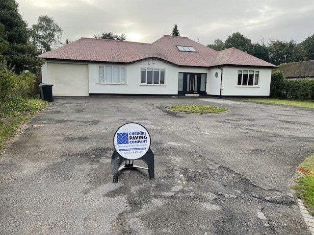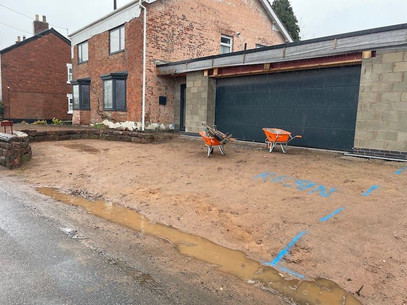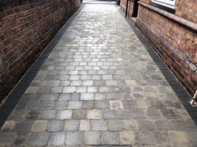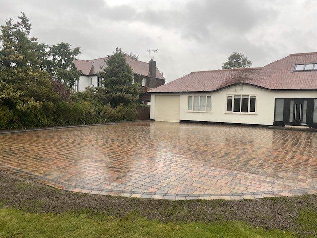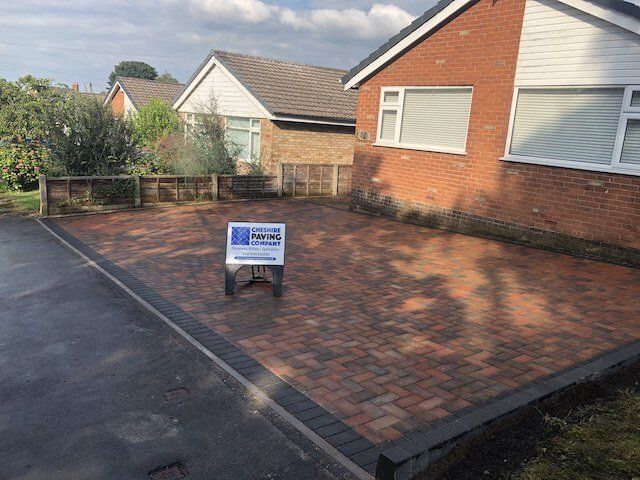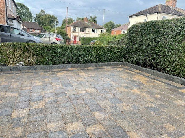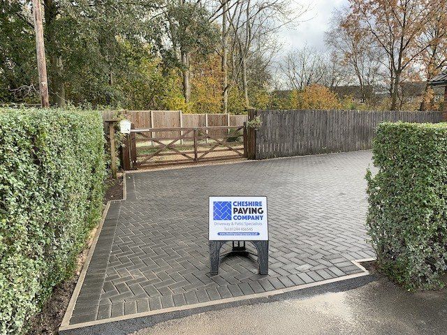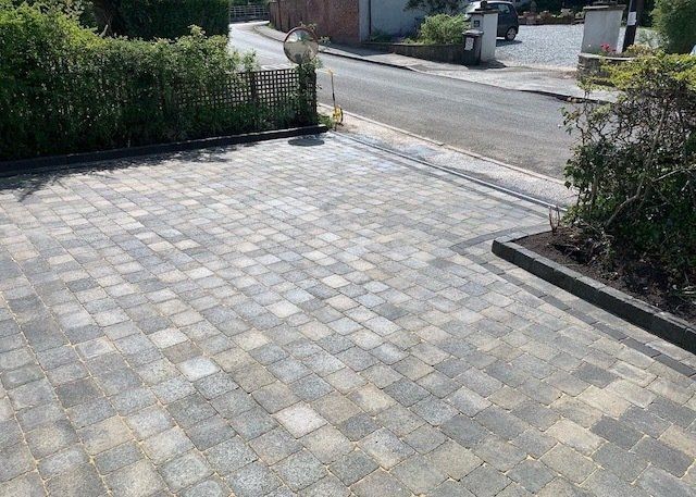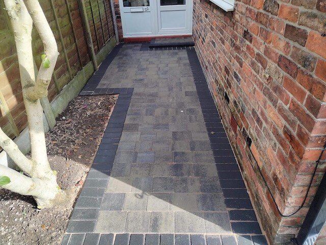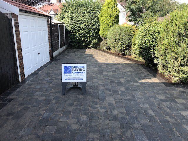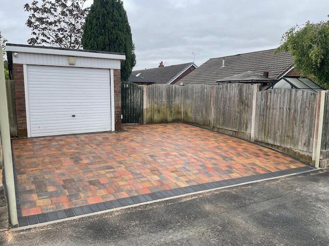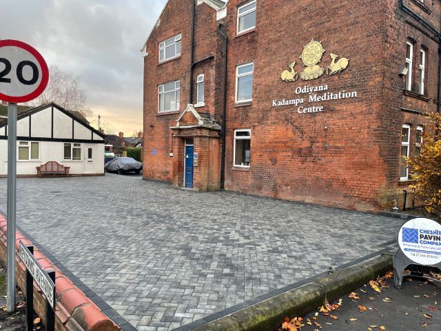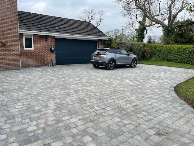 BELOW: A Car Park / Driveway Project Completed In Northwich Cheshire. The Car Park & Pathways Are Finished In Tobermore Pedesta Block Paving In The Colour Of Slate With Charcoal Treble Borders. Full Dig Out, New MOT Type 1 Sub Base With Geo Textile Membrane, Recess Manhole Covers, Drainage Channels & Kerbs.
