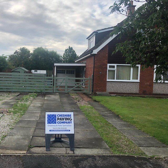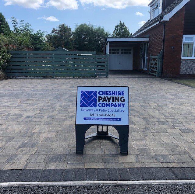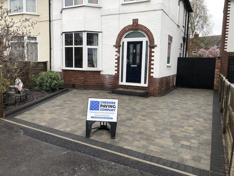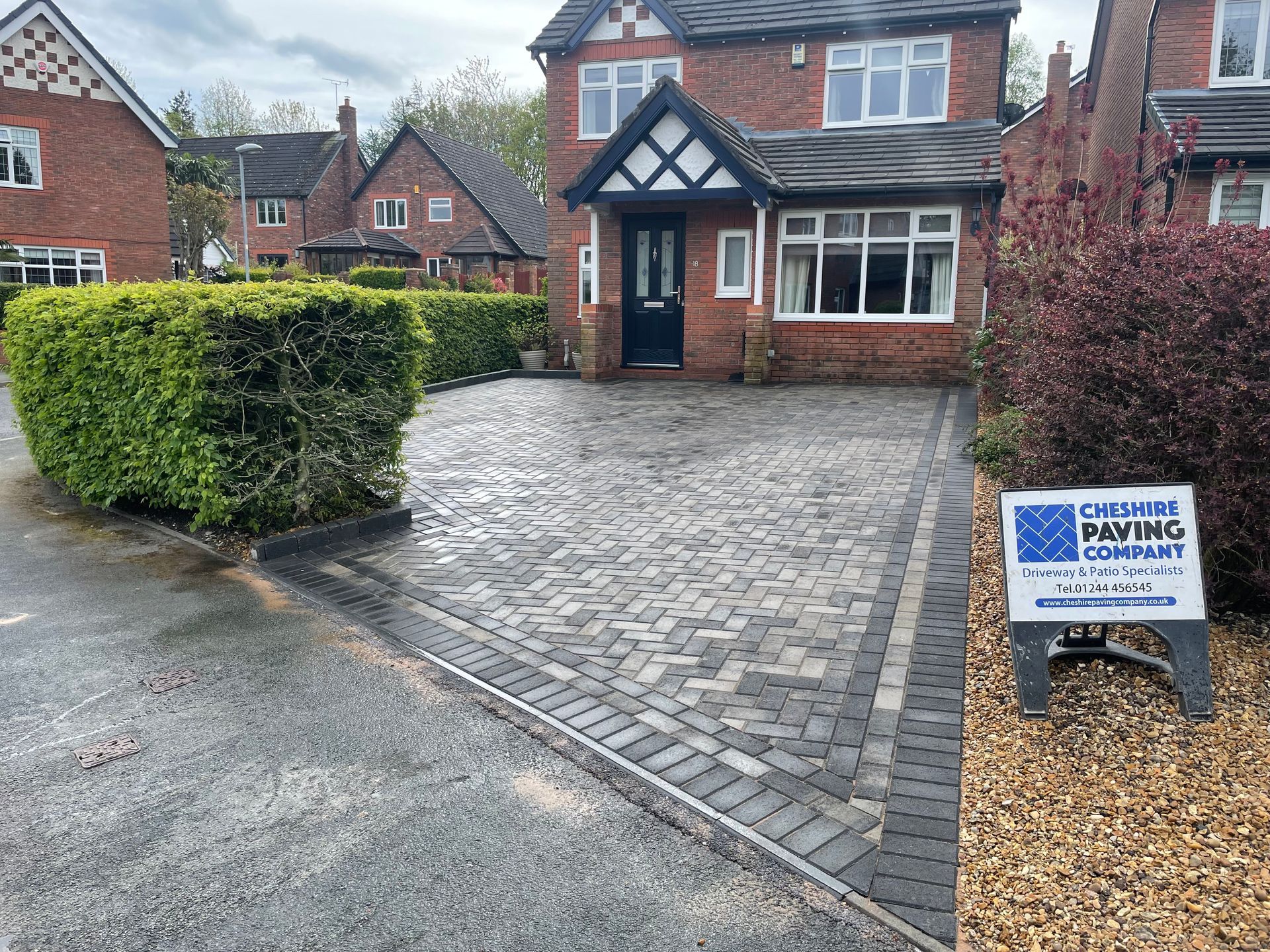 BELOW: A completed driveway project in Mickle Trafford, Chester, Cheshire. This driveway is finished in slate coloured Tobermore Shannon block paving with a Charcoal Shannon border. The project required a full dig out, new MOT Type 1 sub base with Geo Textile membrane, drainage channels, recess manhole cover and new kerbs.