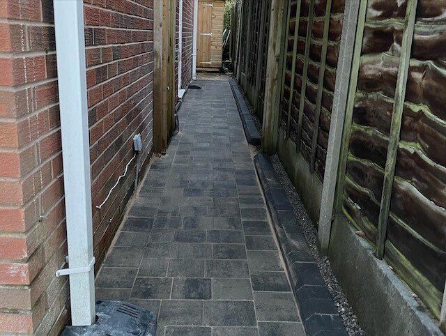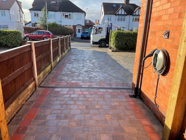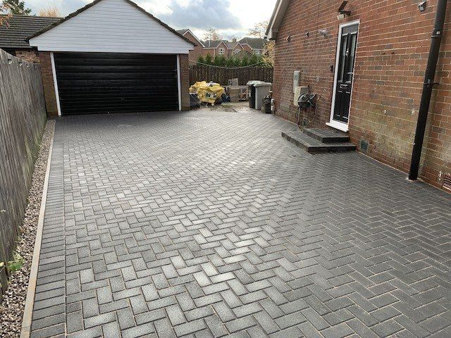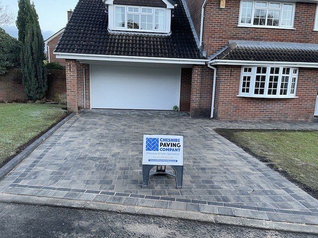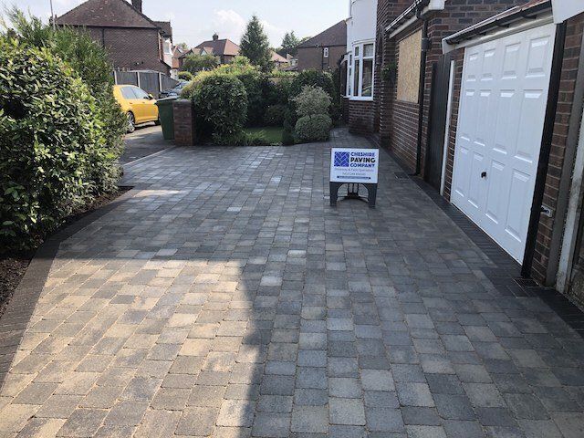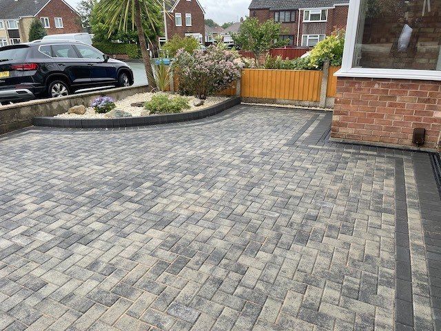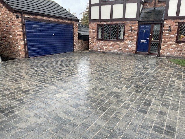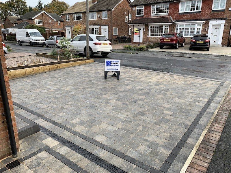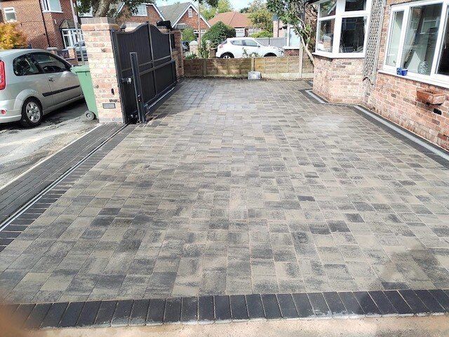 BELOW: A Driveway Project Completed In Handforth, Wilmslow Cheshire. The Driveway Is Finished In Tobermore Shannon Block Paving In The Colour Of Slate With Charcoal Pedesta Borders. Full Dig Out, New MOT Type 1 Sub Base With Geo Textile Membrane, Recess Manhole Covers, Steps & Linear Drainage Channels.