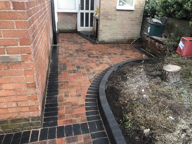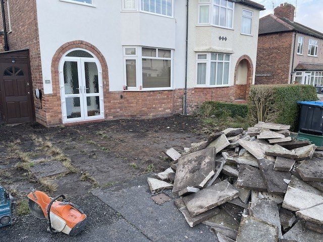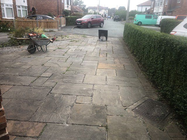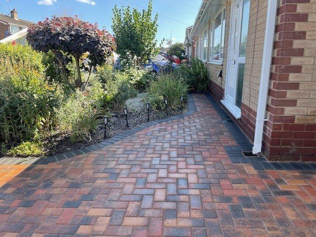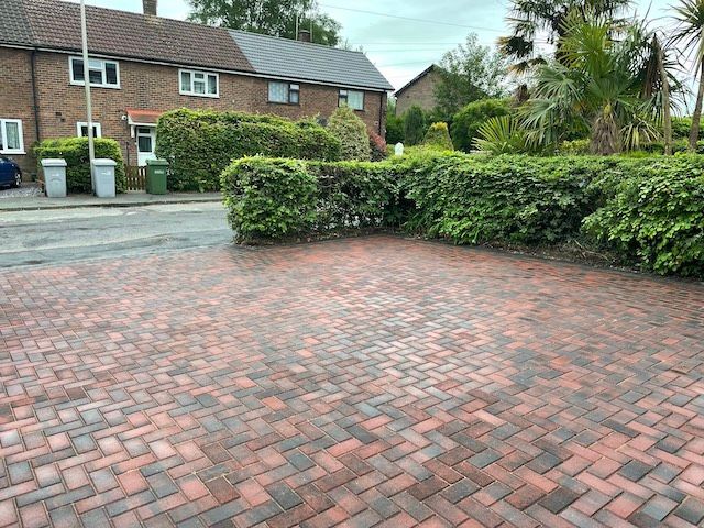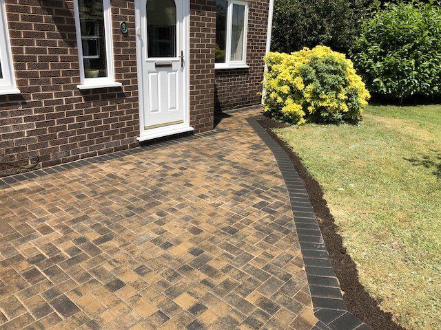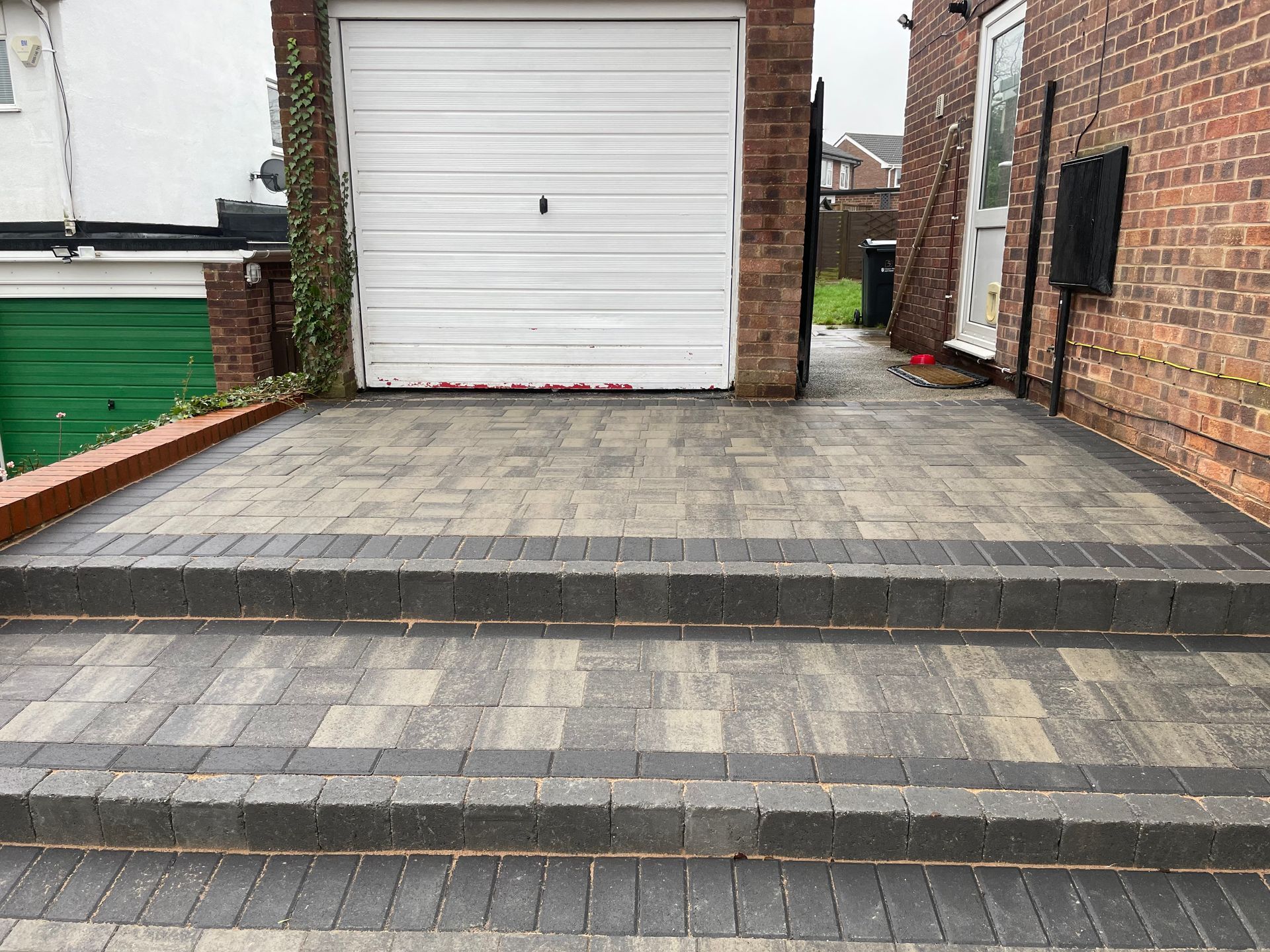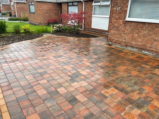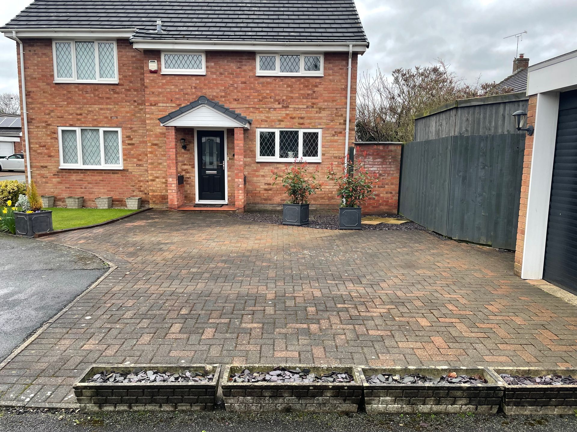 BELOW: A new driveway completed in Liverpool Road, Upton, Chester. This driveway is finished in heather coloured Tobermore Tegula block paving with heather kerb stones to flower bed and new steps. A full dig out was required using MOT Type 1 hardcore sub base and a Geo Textile membrane plus drainage channels.