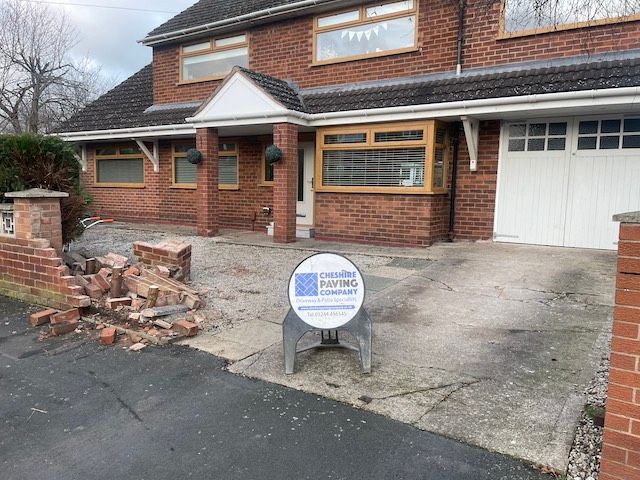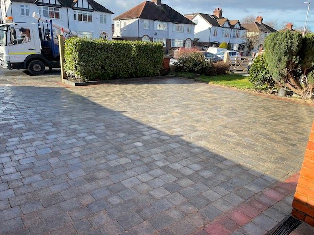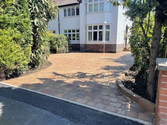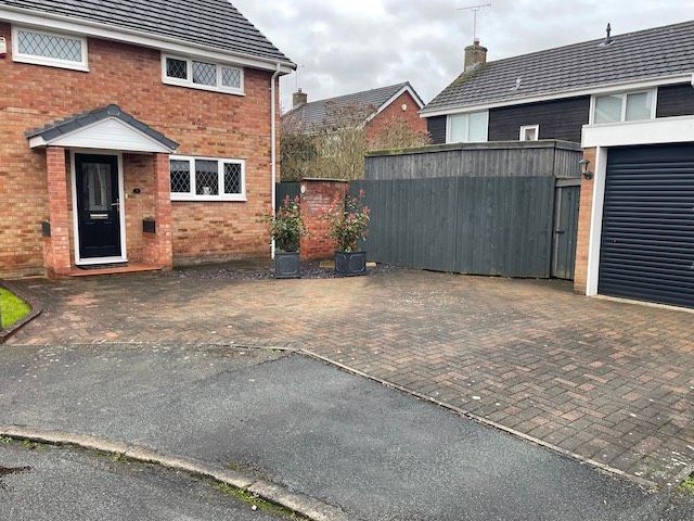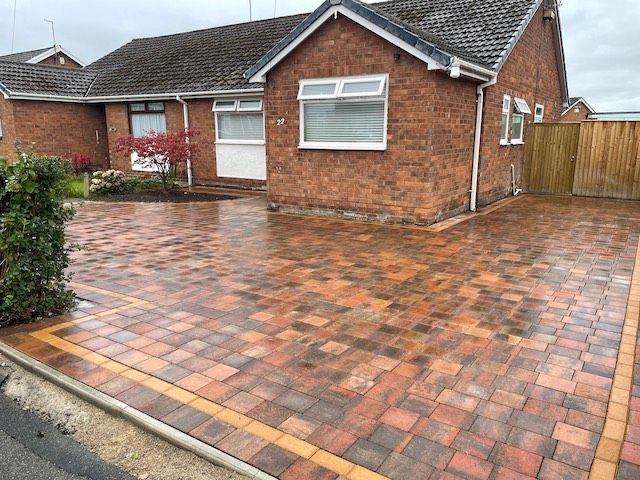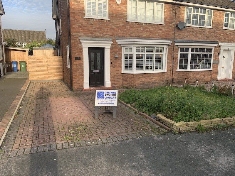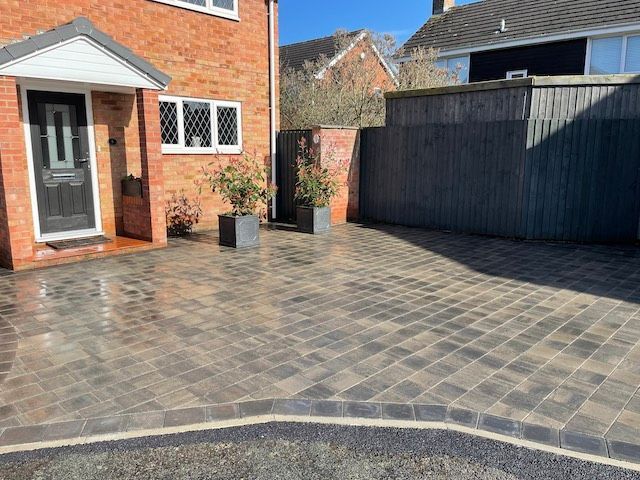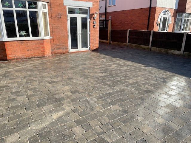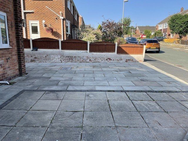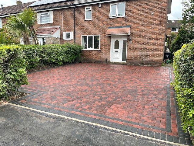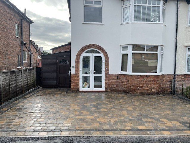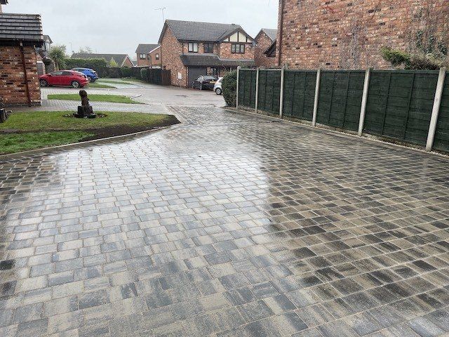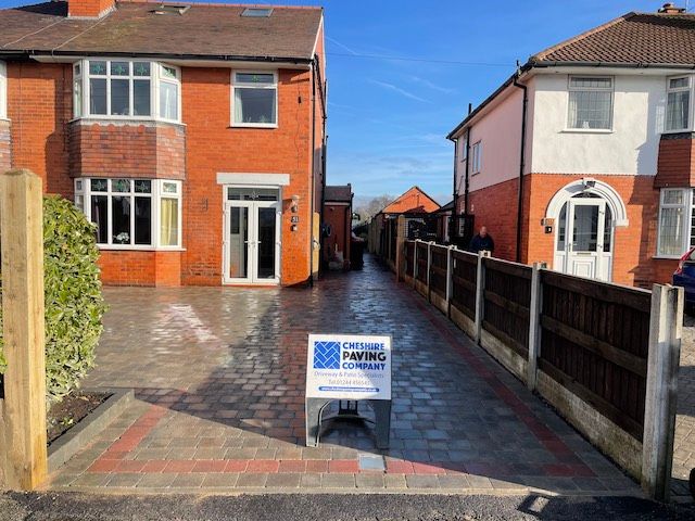 BELOW: A Driveway Project Completed In Hoole, Chester Cheshire. This Driveway Is Finished In Tobermore Shannon Block Paving In The Colour Heather With Pedesta Heather Border. Full Dig Out, New MOT Type 1 Sub Base With Geo Textile Membrane, New Pillar To Front Wall Widening Entrance Way, Edging Kerbs, Drainage Channels, New Kerbstones Steps & Recess Mahole Covers.