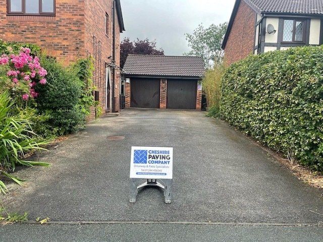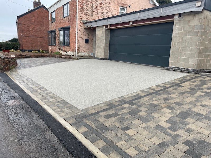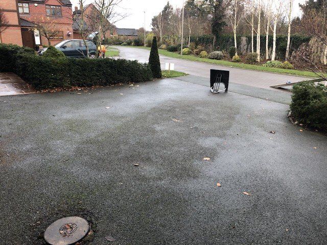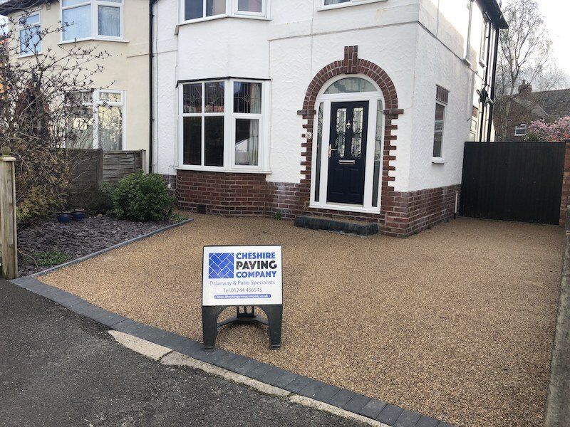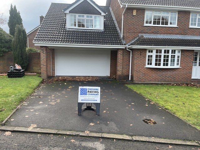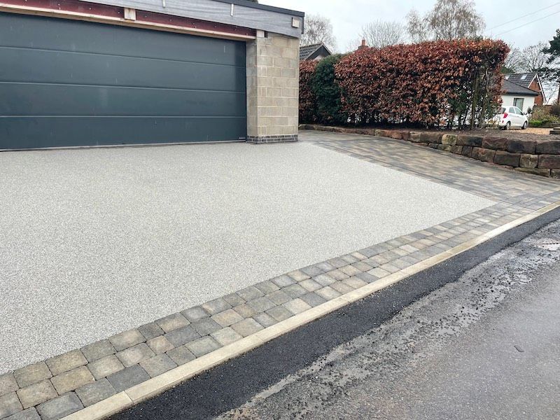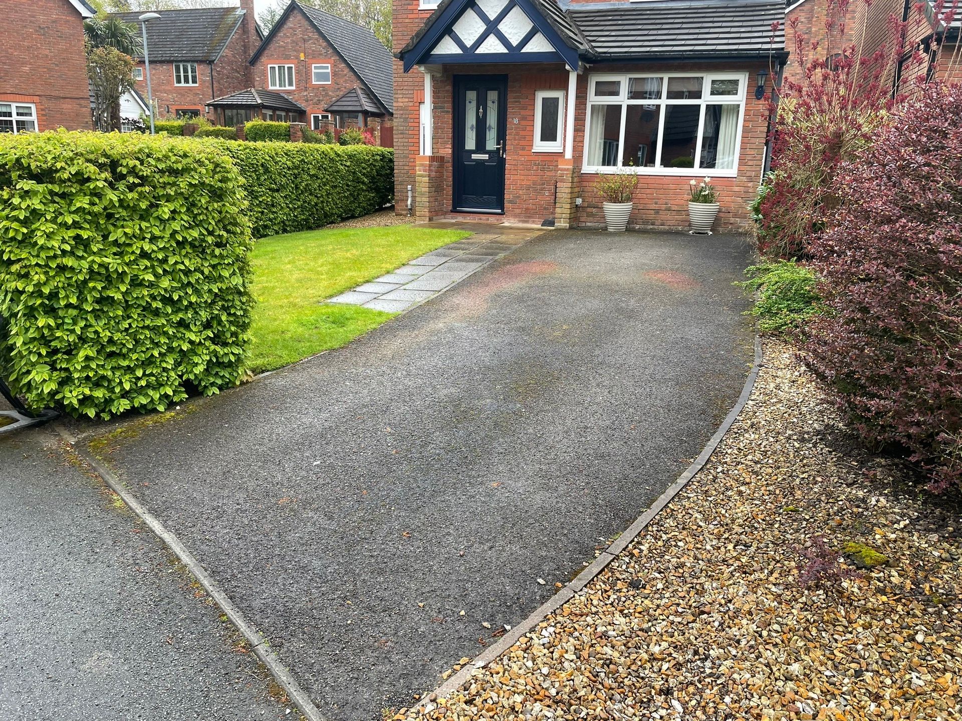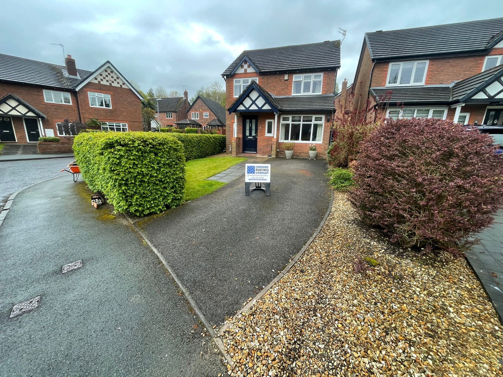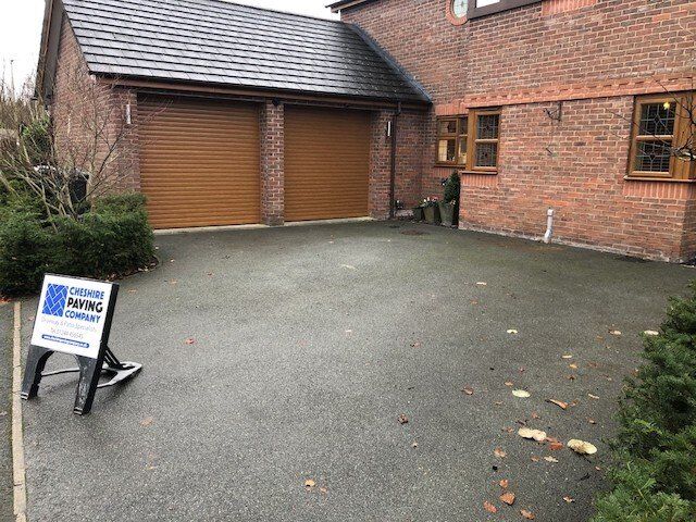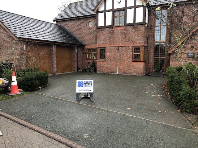 BELOW: A completed driveway project in Kingsley, Frodsham, Cheshire. A fully permeable driveway finished in UV resin bound aggregates with tarmac sub base and Tobermore Tegula blocked paved borders in the central area. The right and left hand sides are finished in slate coloured Tobermore Tegula Hydropave permeable block paving with a charcoal Pedstra inlaid border.