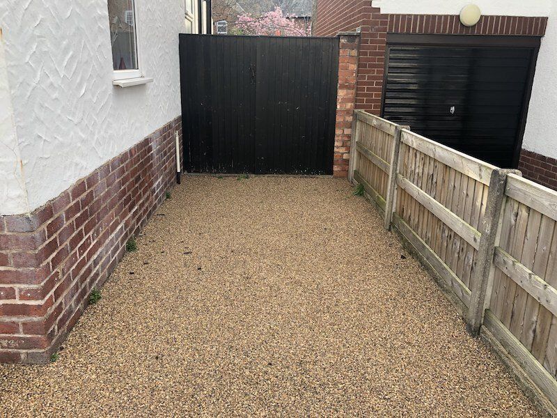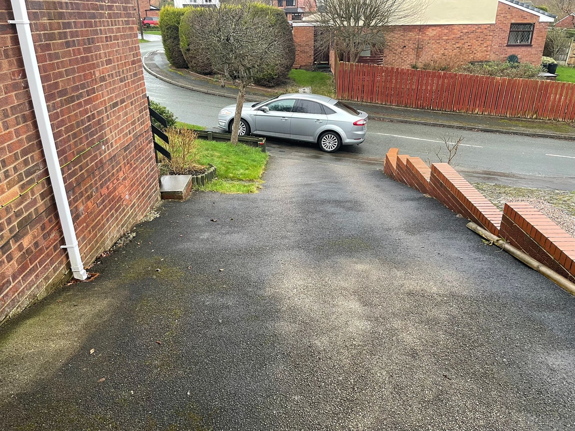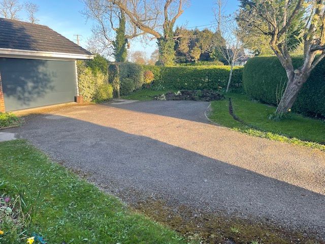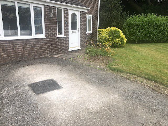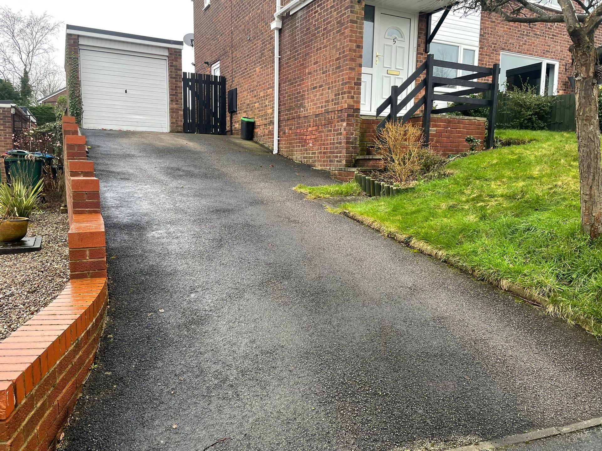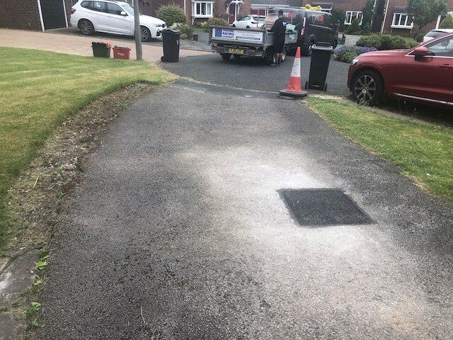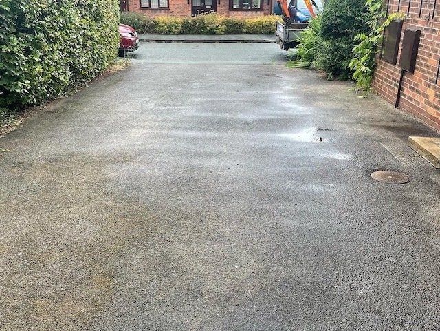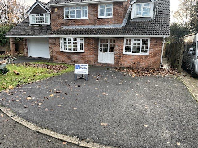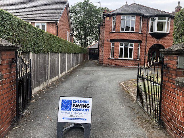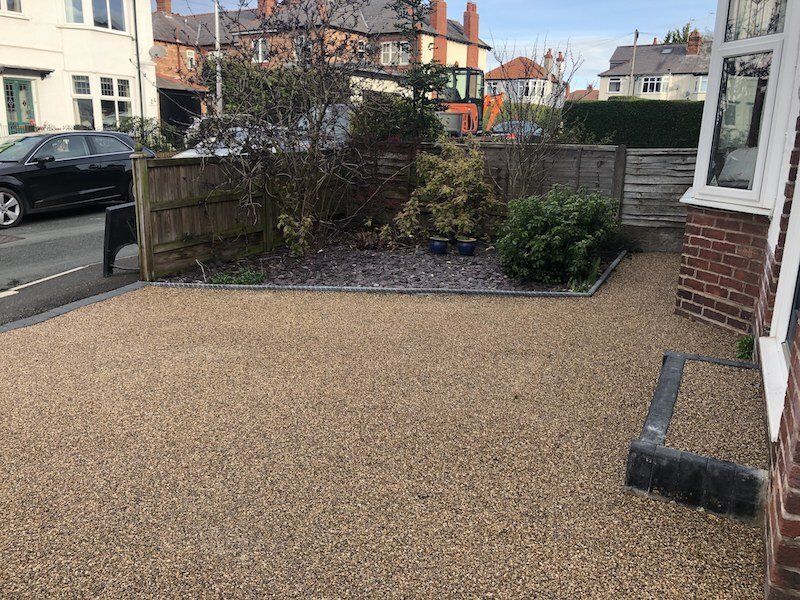 BELOW: A completed driveway project in Kingsley, Frodsham, Cheshire. A fully permeable driveway finished in UV resin bound aggregates with tarmac sub base and Tobermore Tegula blocked paved borders in the central area. The right and left hand sides are finished in slate coloured Tobermore Tegula Hydropave permeable block paving with a charcoal Pedstra inlaid border.