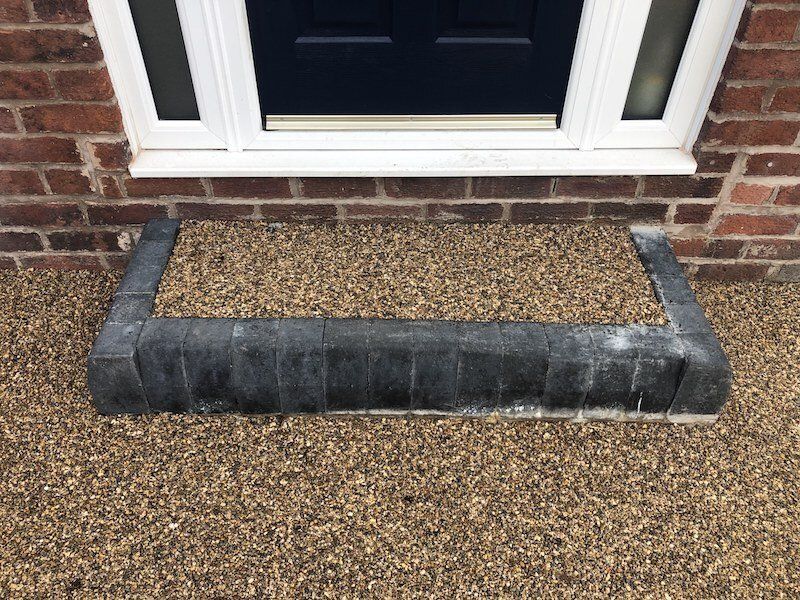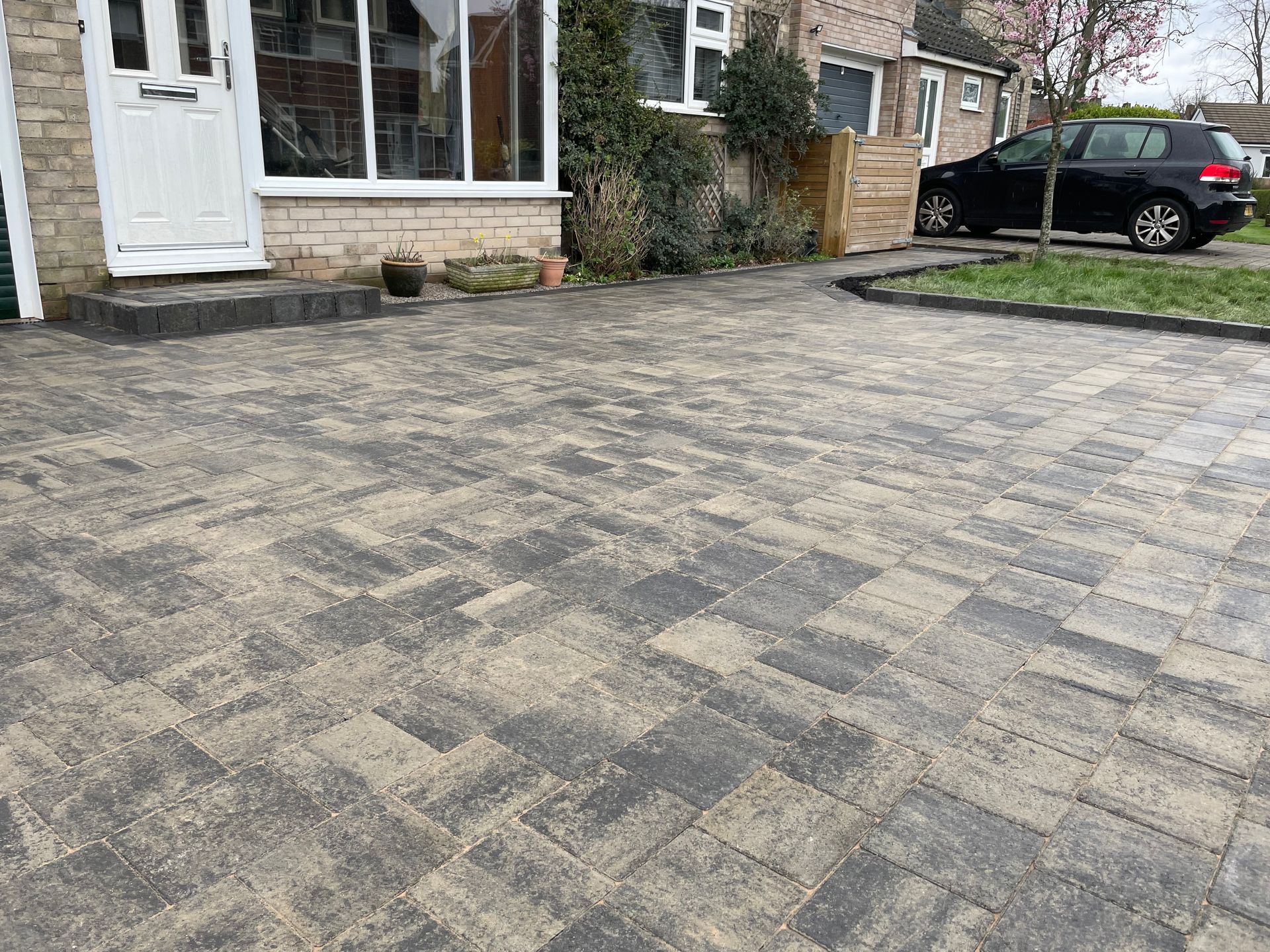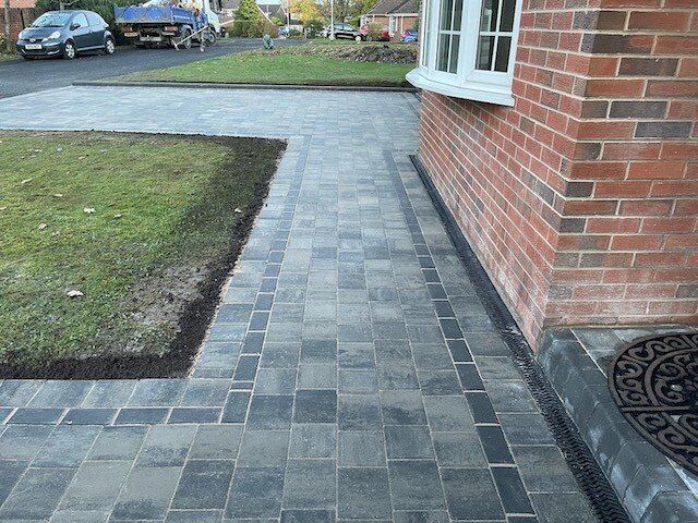 BELOW: A new driveway project completed in Chelford, near Knutsford, Cheshire. This driveway is finished in slate colour Tobermore Shannon block paving with charcoal coloured borders. The project required a full dig out, new MOT type 1 sub base with Geo Textile membrane, linear drainage channels, KS key kerbs to the grass edge and new front door step.
