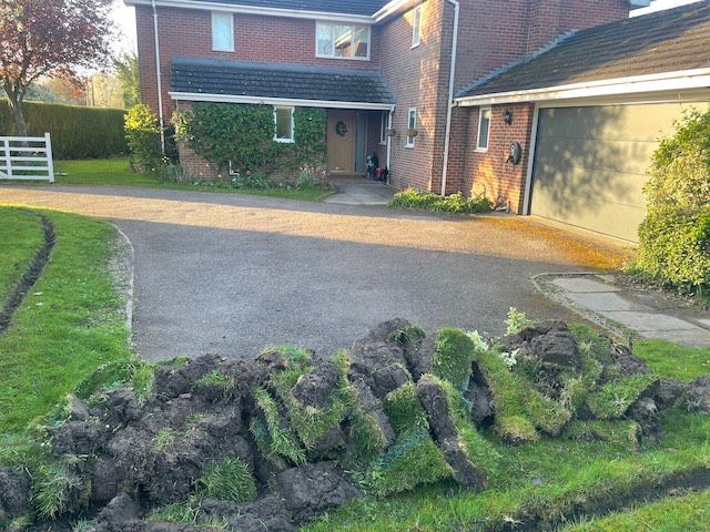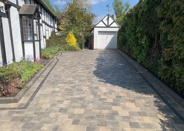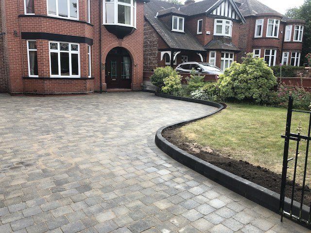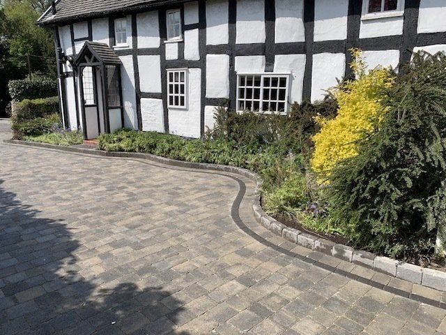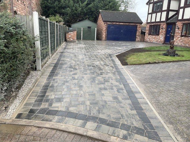 BELOW: A new driveway completed by the team in Church Minshull near Nantwich, Cheshire.This driveway is finished in Tobermore Tegula slate block paving with a charcoal Pedesta inlay border and kerbstone kerbs to flower bed borders. The project involved a full dig out, new sub base, drainage and kerbs.