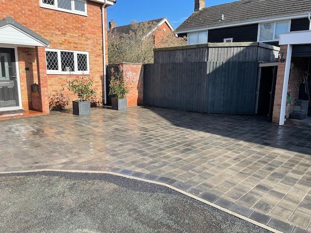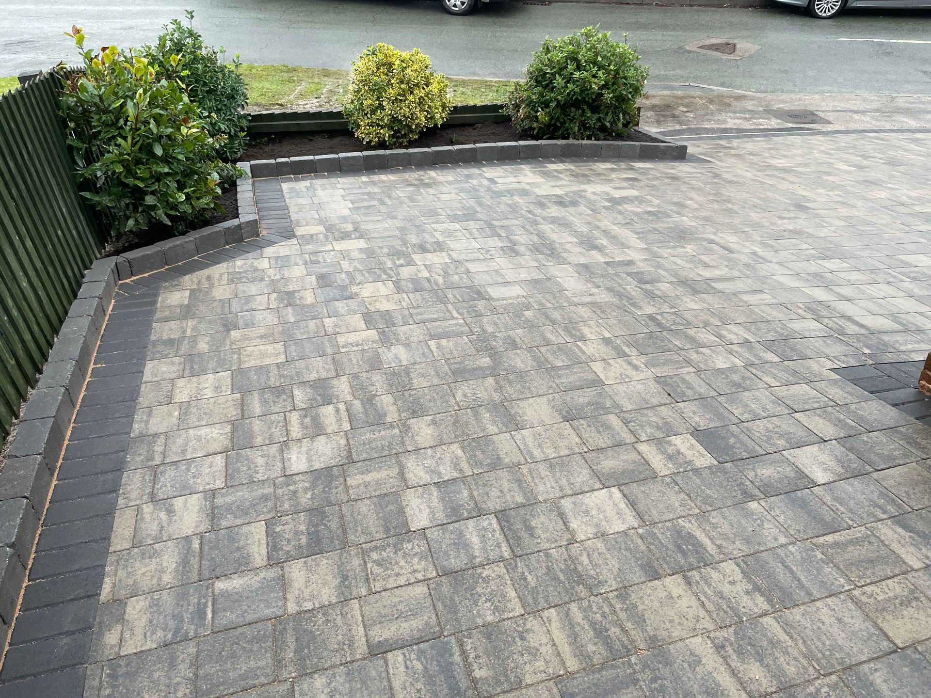 BELOW: A Driveway Project Completed This Week In Chester, Cheshire. The Driveway Is Finished In Tobermore Shannon Block Paving In The Colour Of Slate With Charcoal Pedesta Borders. Full Dig Out, New MOT Type 1 Sub Base With Geo Textile Membrane, Recess Manhole Cover, Kerbstone Steps & Kerbstones To Flowerbed.