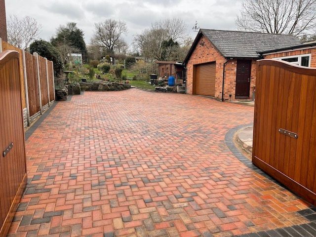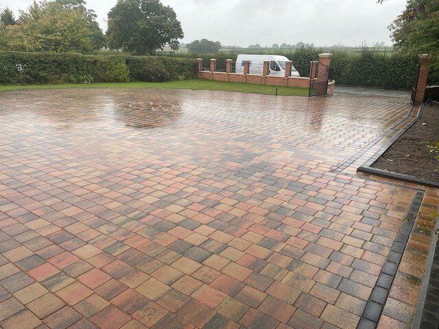 BELOW: This driveway in Alpraham, Tarporley, Cheshire, is completed in heather coloured Tobermore Pedesta block paving with a charcoal Pedesta border. The project required a full dig out, with MOT Type 1 sub base and Geo Textile membrane, drainage channels, recess manhole covers and Kerbstone kerbs.