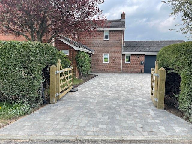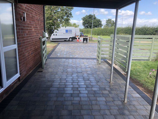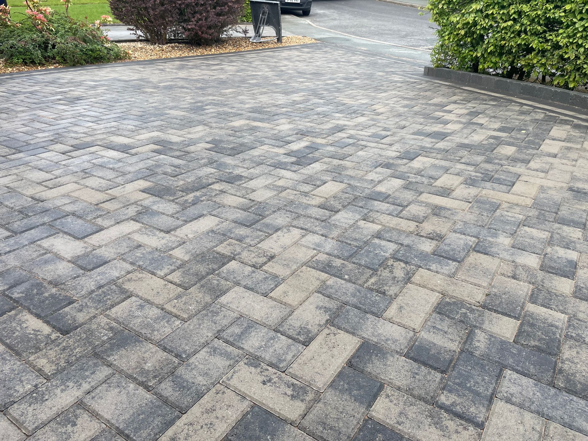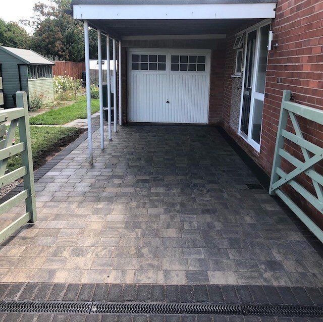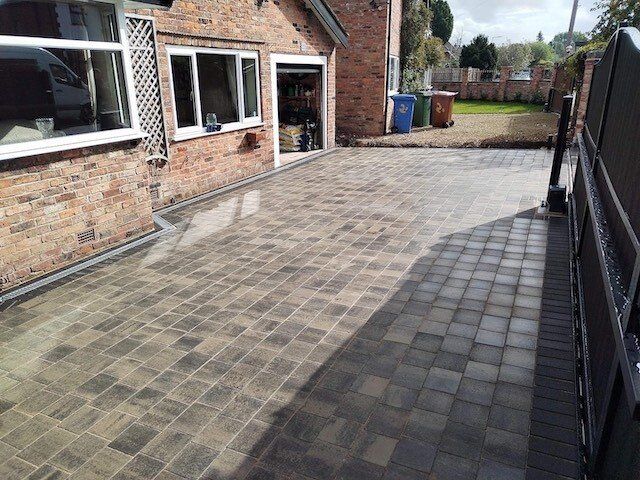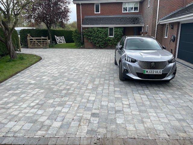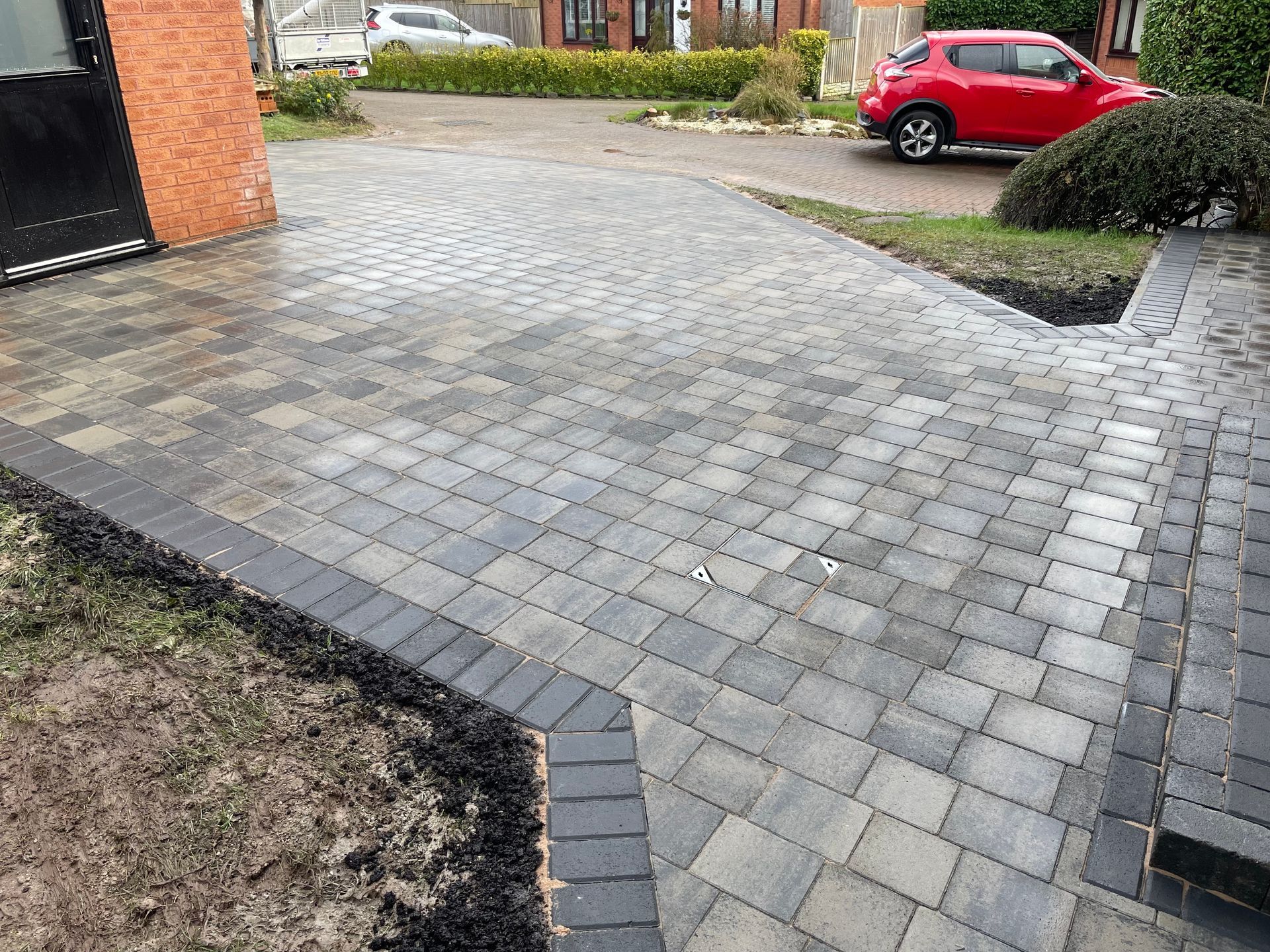 BELOW: A new driveway project completed in Haslington, near Crewe, Cheshire. This driveway is finished in slate coloured Tobermore Shannon block paving with charcoal coloured borders. The project required a full dig out, new MOT Type 1 sub base with Geo Textile Membrane, linear drainage channels, recess manhole covers and edging kerbs.