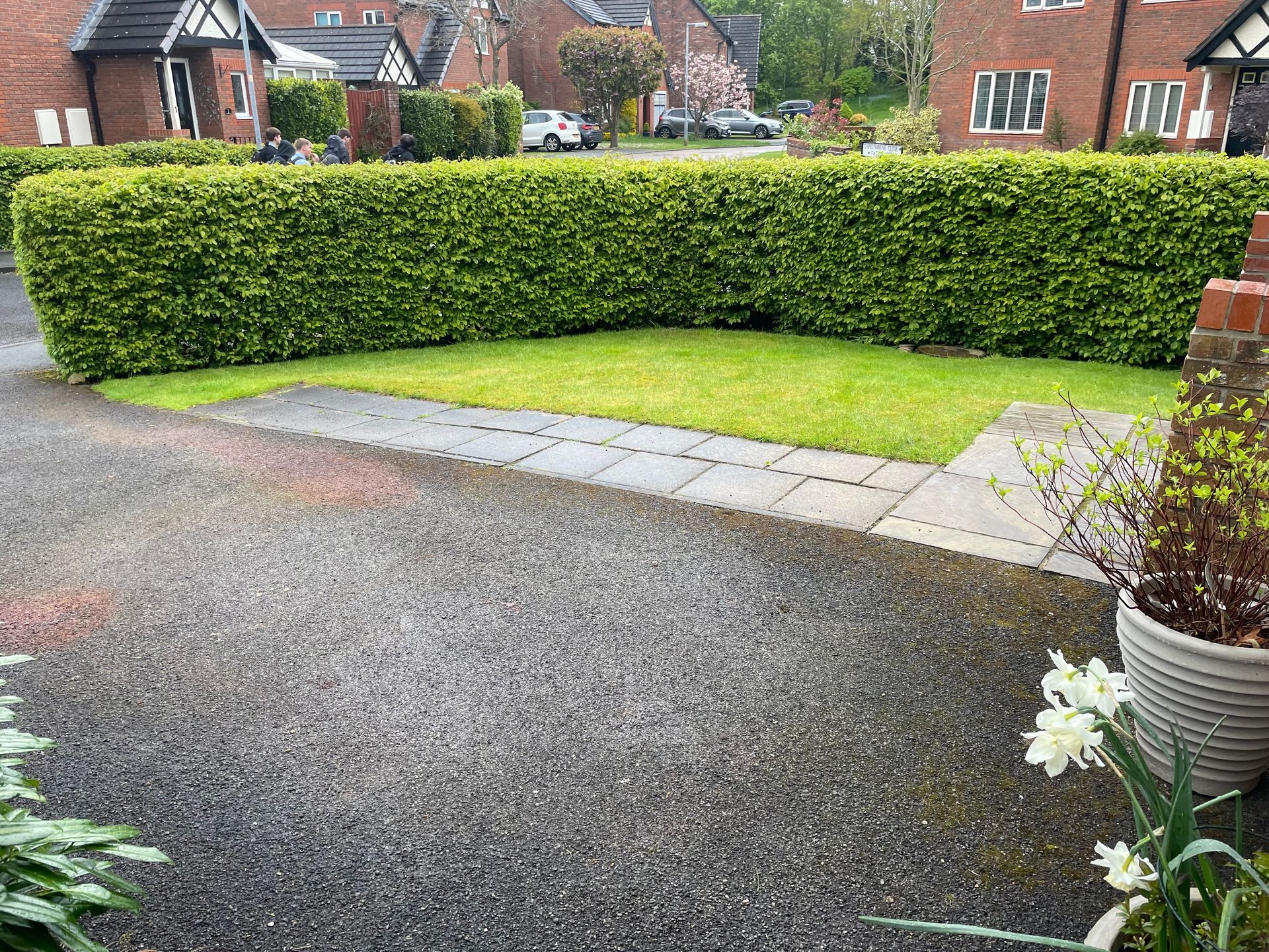BELOW: A Driveway Project Completed In Appleton, Warrington Cheshire. The Driveway Is Finished In Tobermore Tegula Block Paving In The Colour Of Slate With A Charcoal Pedesta Inlayed Border. Full Dig Out, New MOT Type 1 Sub Base With Geo Textile Membrane, Rumbled Charcoal Kerbstones To Hedgrow Border & Linear Drainage Channels.
