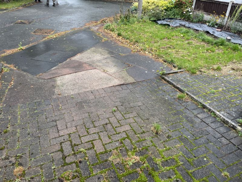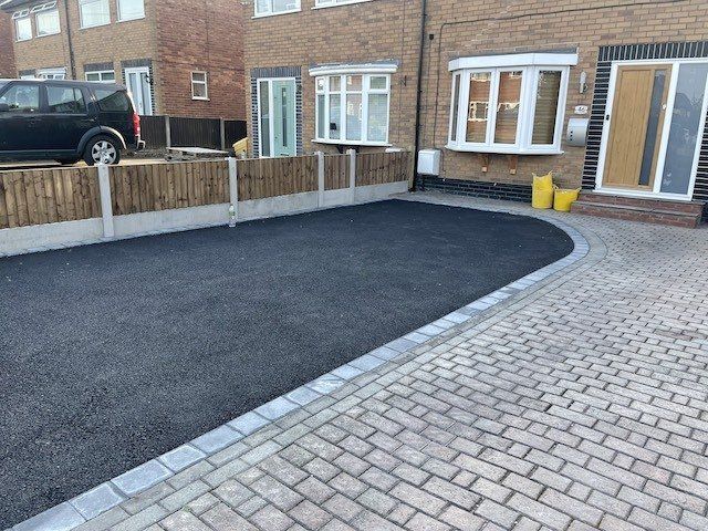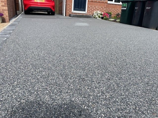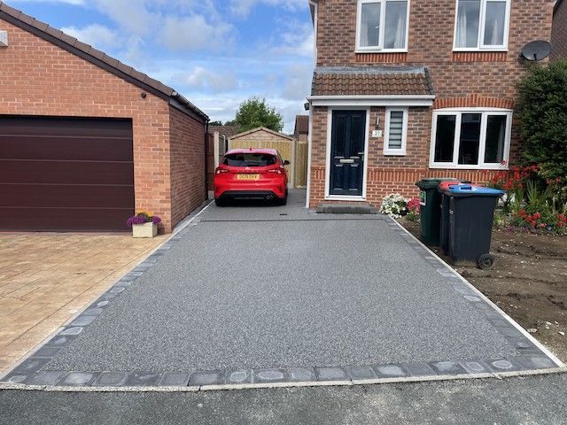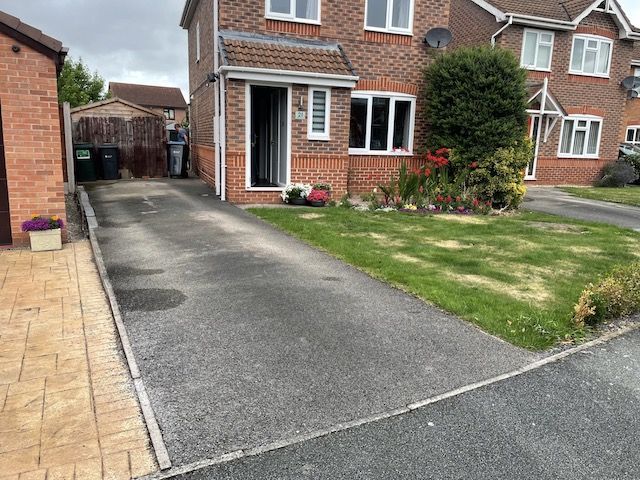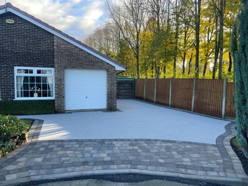 BELOW: A completed driveway project in Kingsley, Frodsham, Cheshire. A fully permeable driveway finished in UV resin bound aggregates with tarmac sub base and Tobermore Tegula blocked paved borders in the central area. The right and left hand sides are finished in slate coloured Tobermore Tegula Hydropave permeable block paving with a charcoal Pedstra inlaid border.
