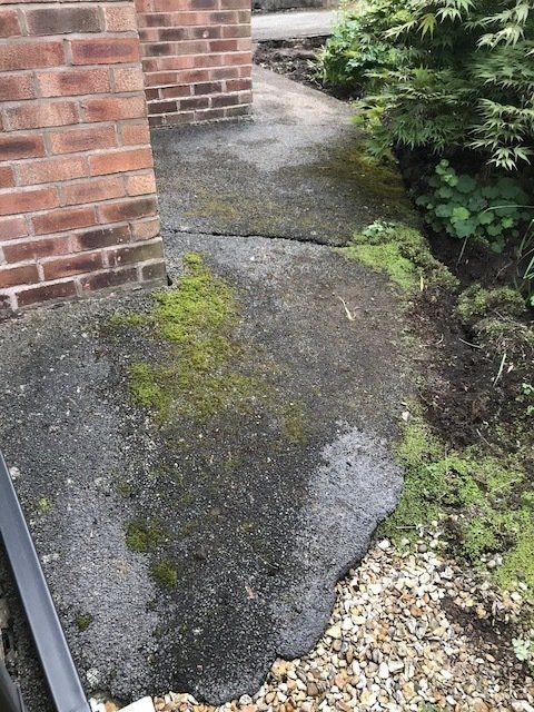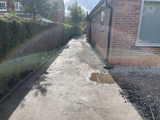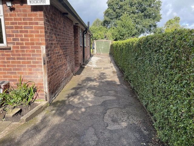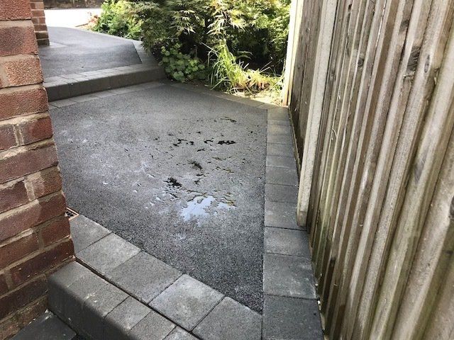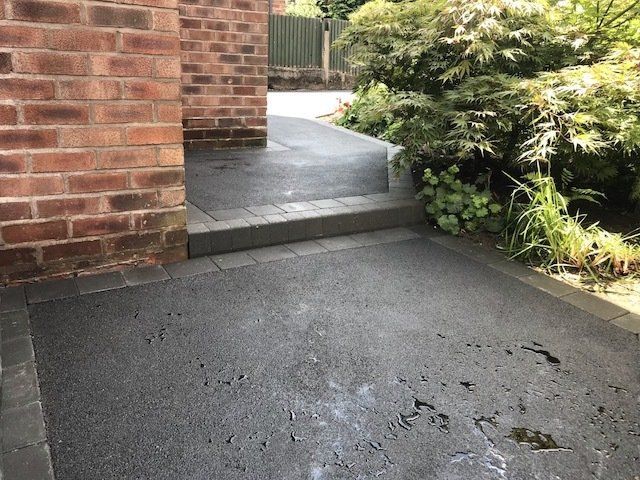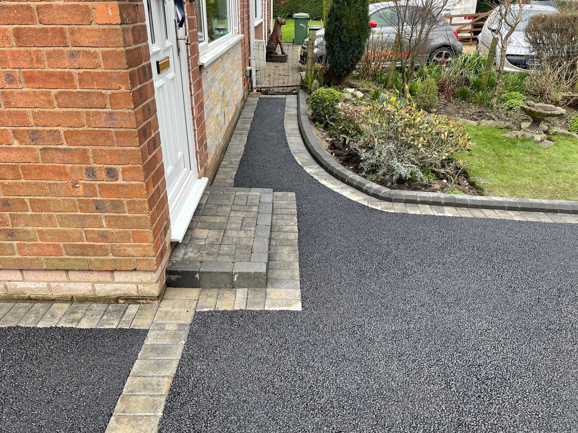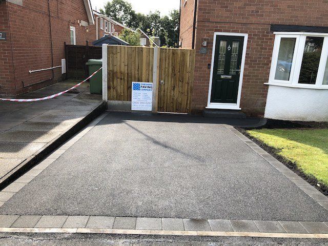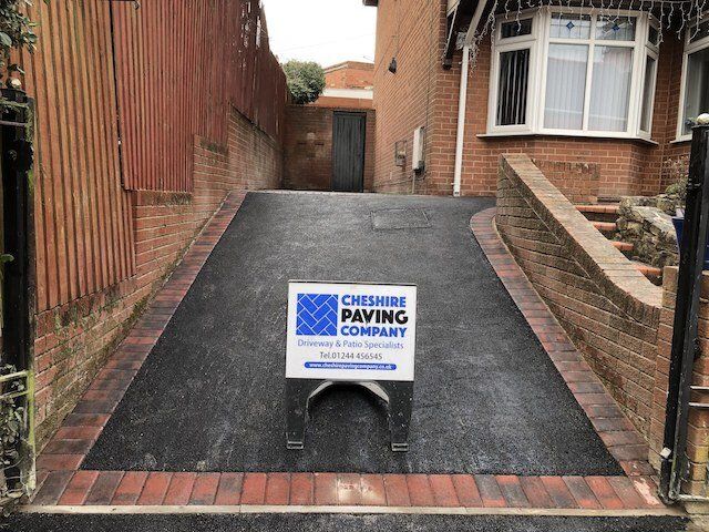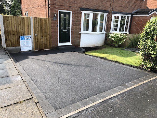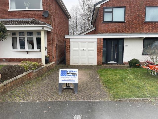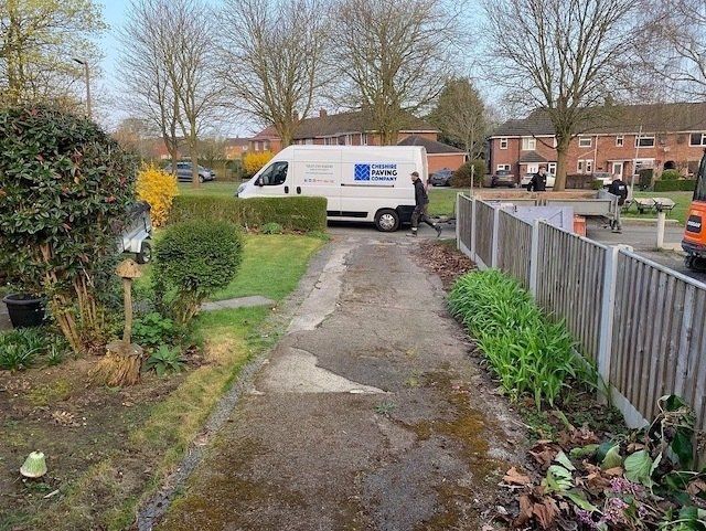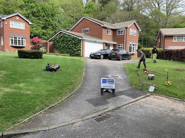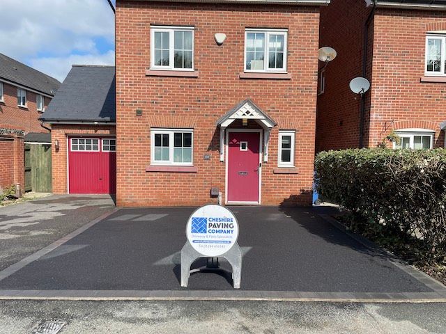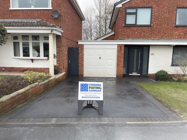 Before and after: A new driveway completed by the Cheshire Paving Company team in Holmes Chapel, Cheshire. This driveway has been finished in 6mm SMA tarmac with a Tobermore Tegula Heather block paving border. Natural Indian stone to pathways. The project involved a full dig out, new sub base, drainage and kerbs.