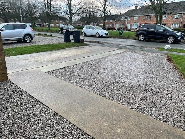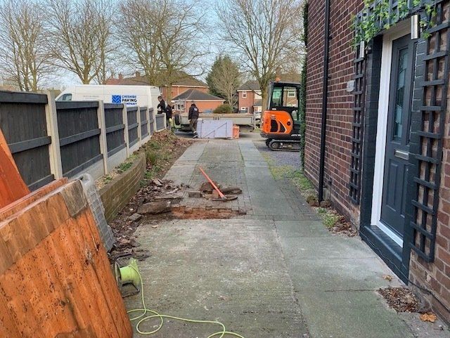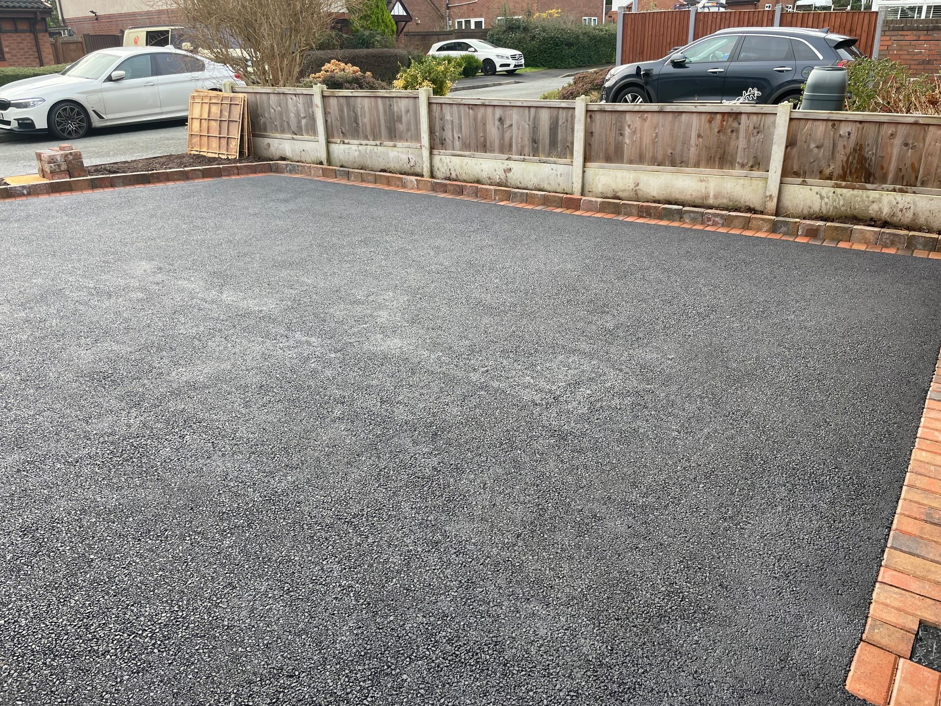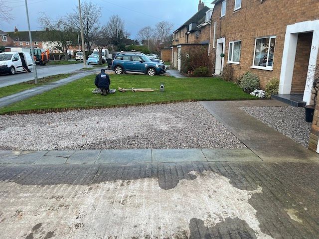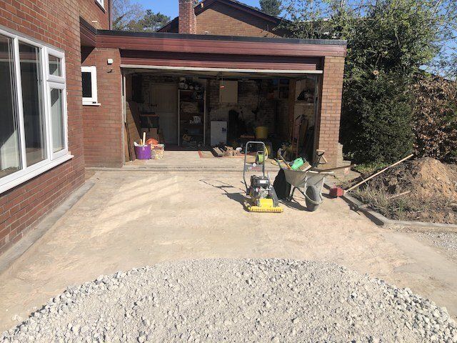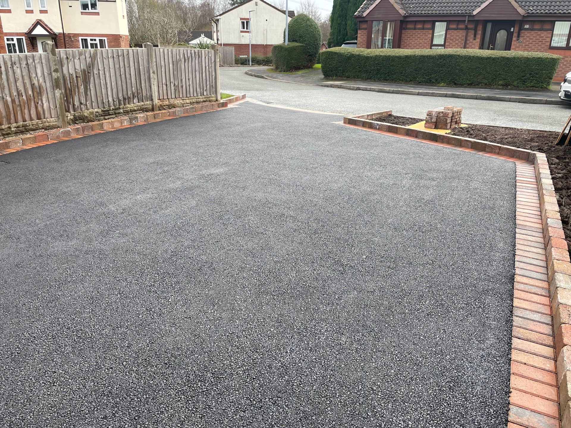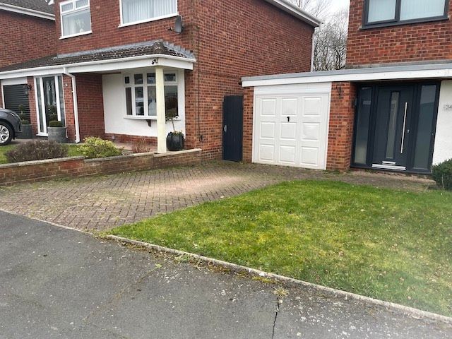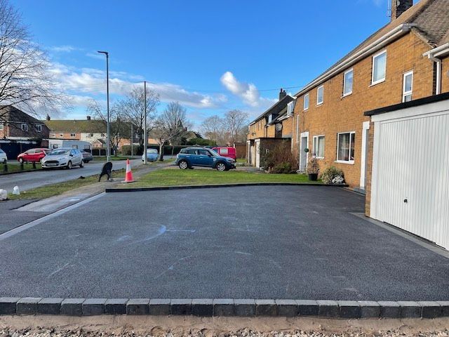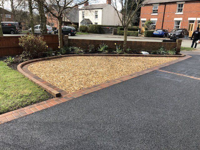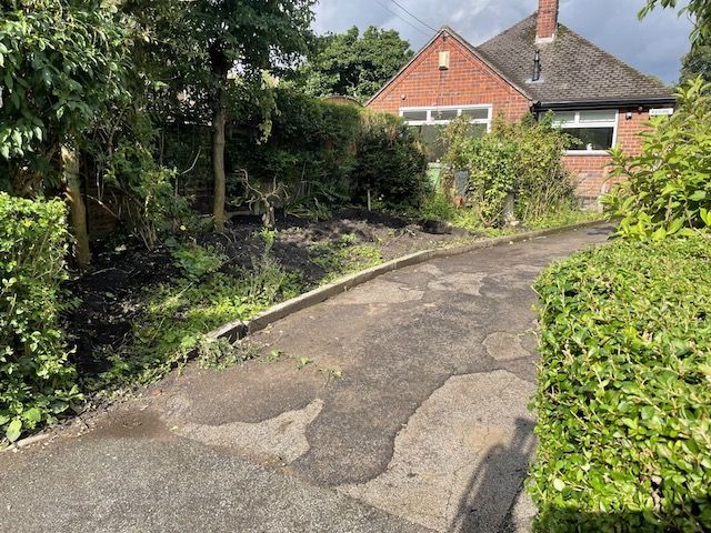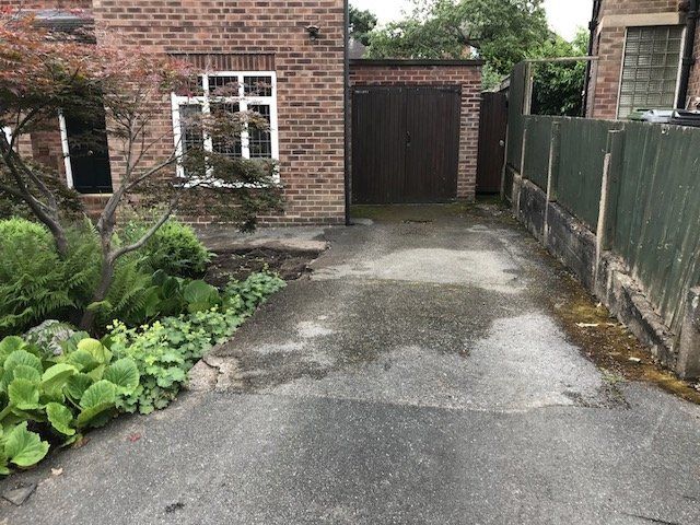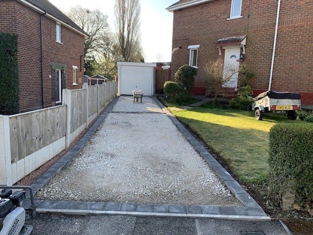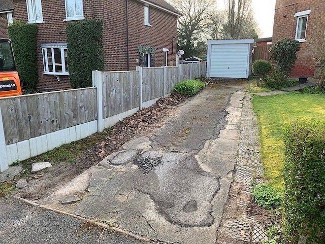 Before and after: A new driveway project completed in Weaverham, Northwich, Cheshire. This driveway was finished in 10mm SMA tarmac with Tobermore Shannon slate coloured block paved borders, edging kerbs, a sleeper wall, recess manhiole covers and linear drainage channels. The project required a full dig out, MOT Type 1 hardcore sub base and Geo Tex membrane.