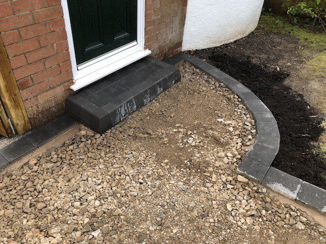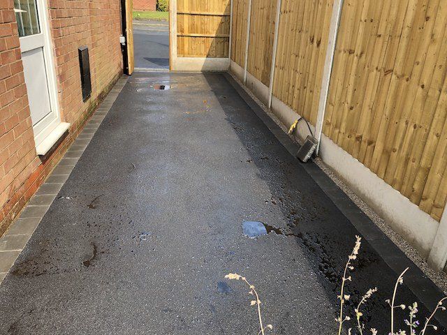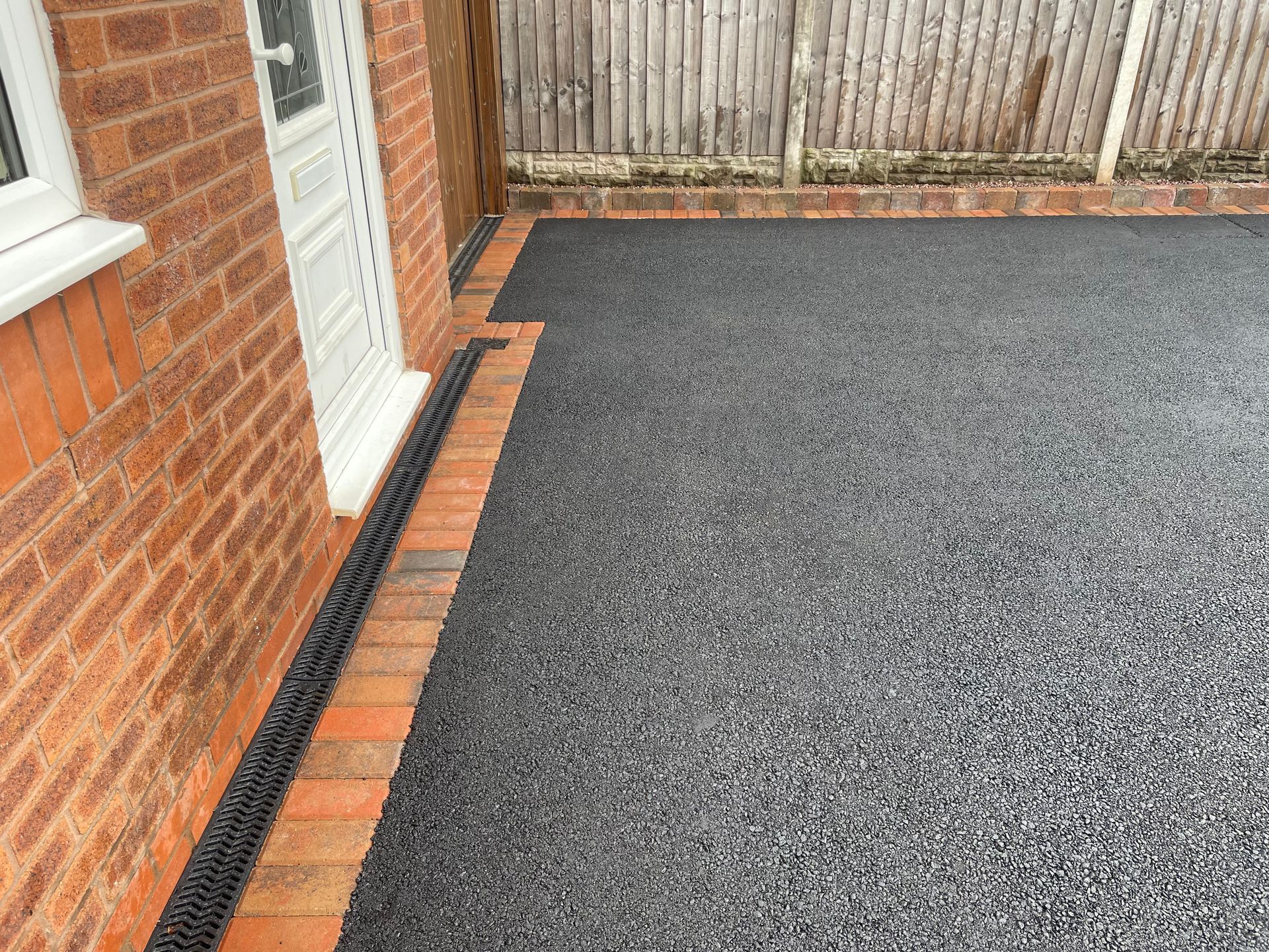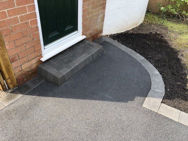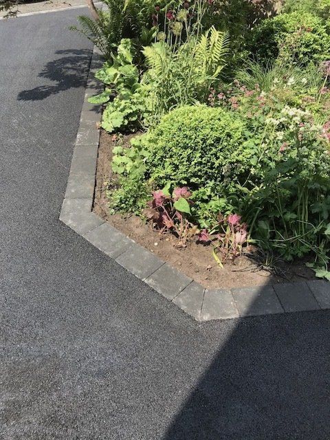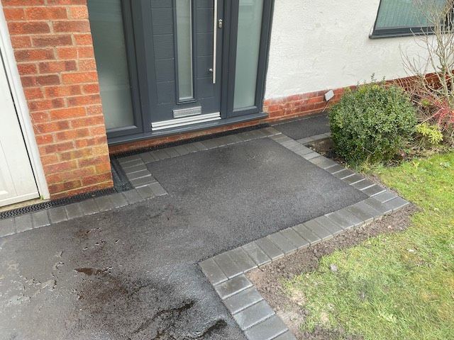 Below, before and after: Driveway project completed in Connahs Quay, Flintshire. A massive transformation. Driveway finished in 6mm ViaDrive tarmac with Tobermore Tegula paving, double borders in bracken and slate. Pathway and entrance way finished in Tobermore Tegula Slate with Charcoal KS Key Kerb Step. New linear drainage channels added and flower beds with top soil, membrane and gravel.