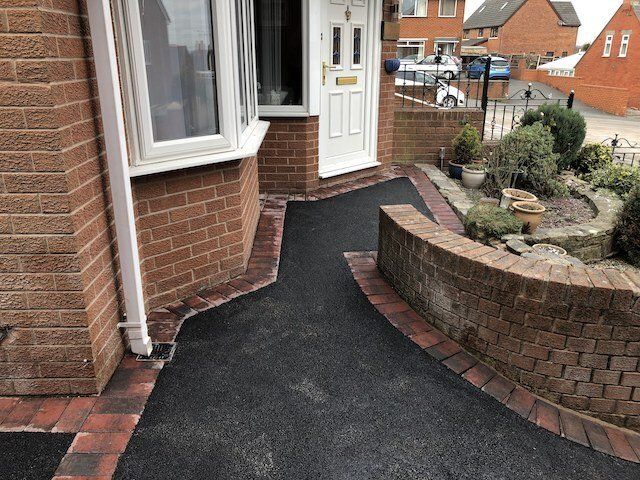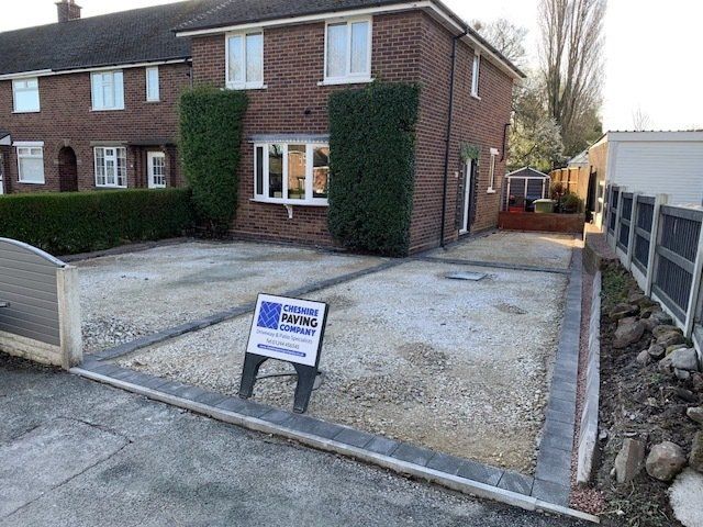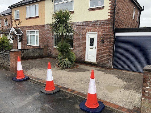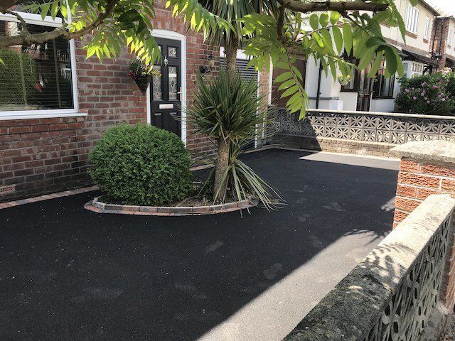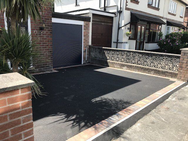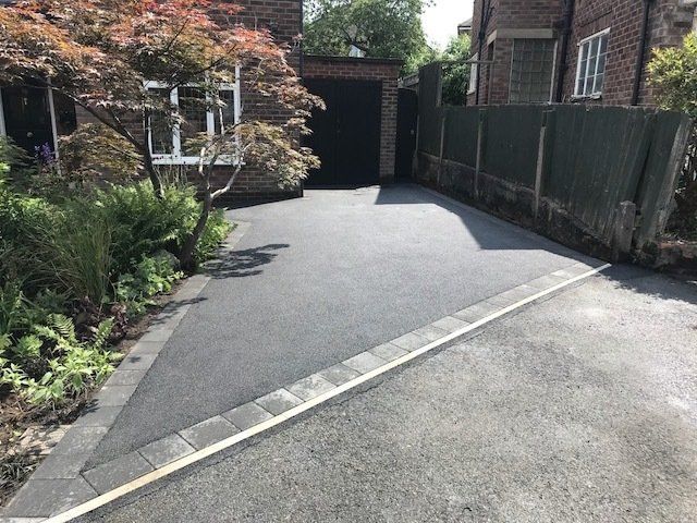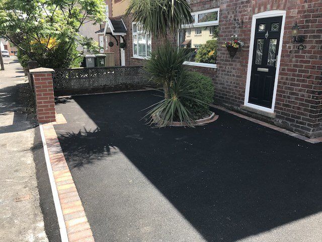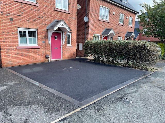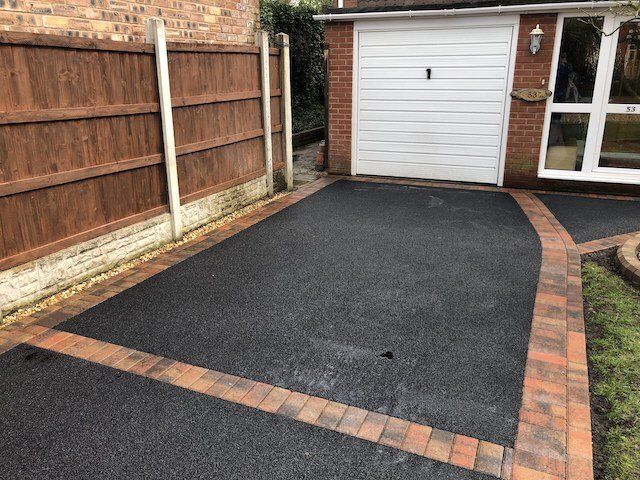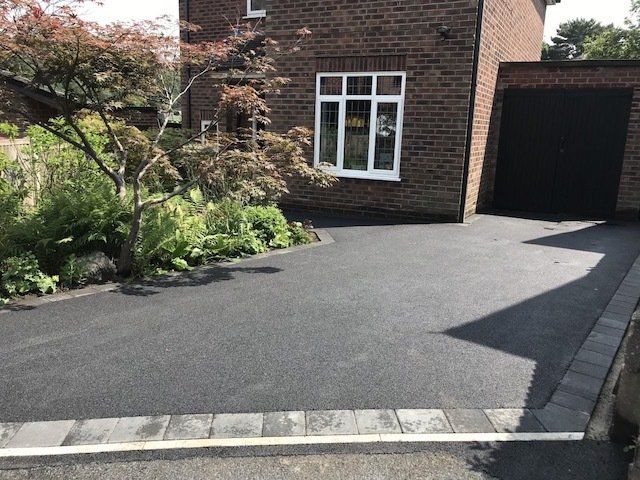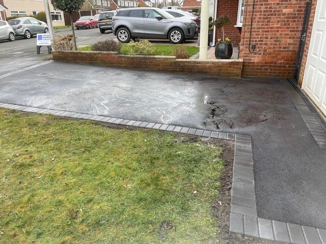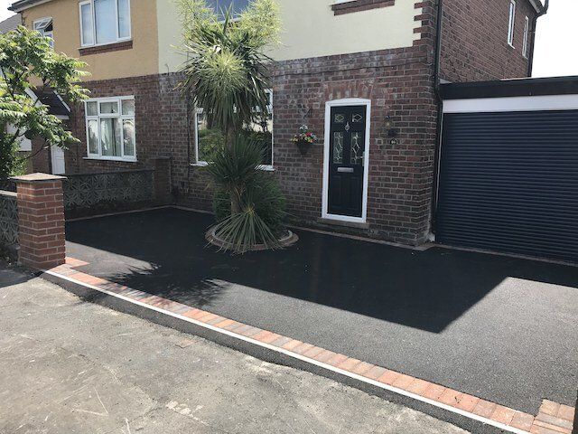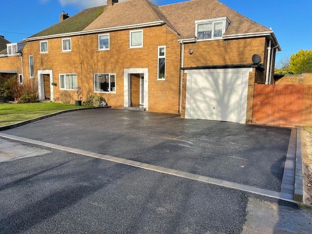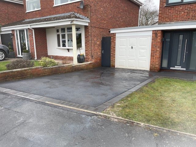 Before and after: A New Driveway Completed In Runcorn Cheshire. This Driveway Is Finished In 10mm SMA Tarmac With Tobermore Pedesta Heather Block Paved Borders, Heather Kerbstones Edging Kerbs & Recess Manhole Covers, Linear Drainage Channels. Full Dig Out, Mot Type 1 Hardcore Sub Base & Geo Tex Membrane.