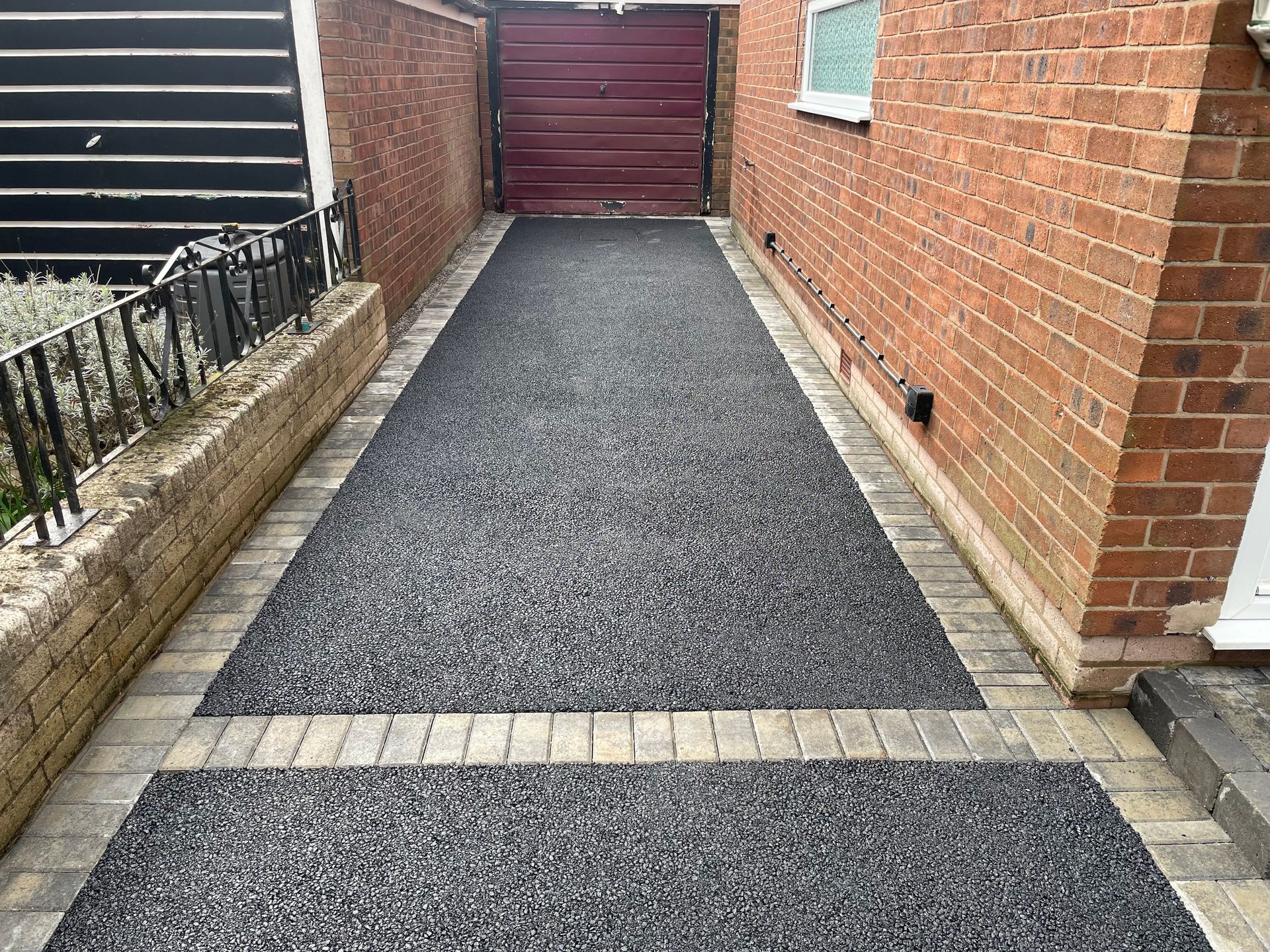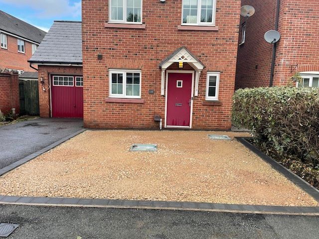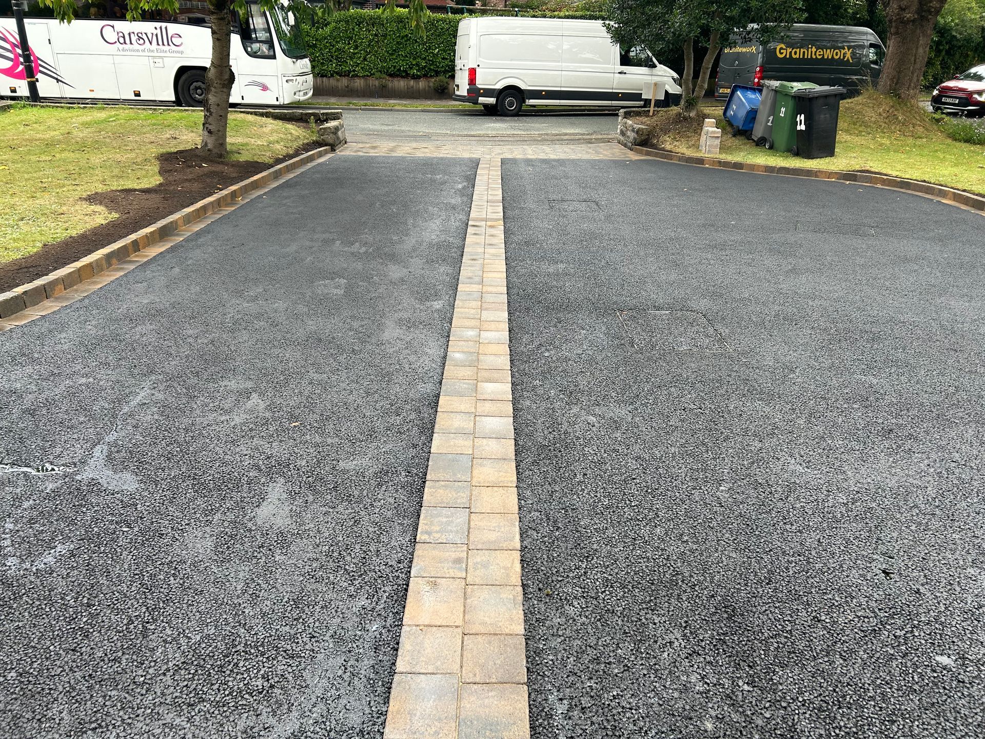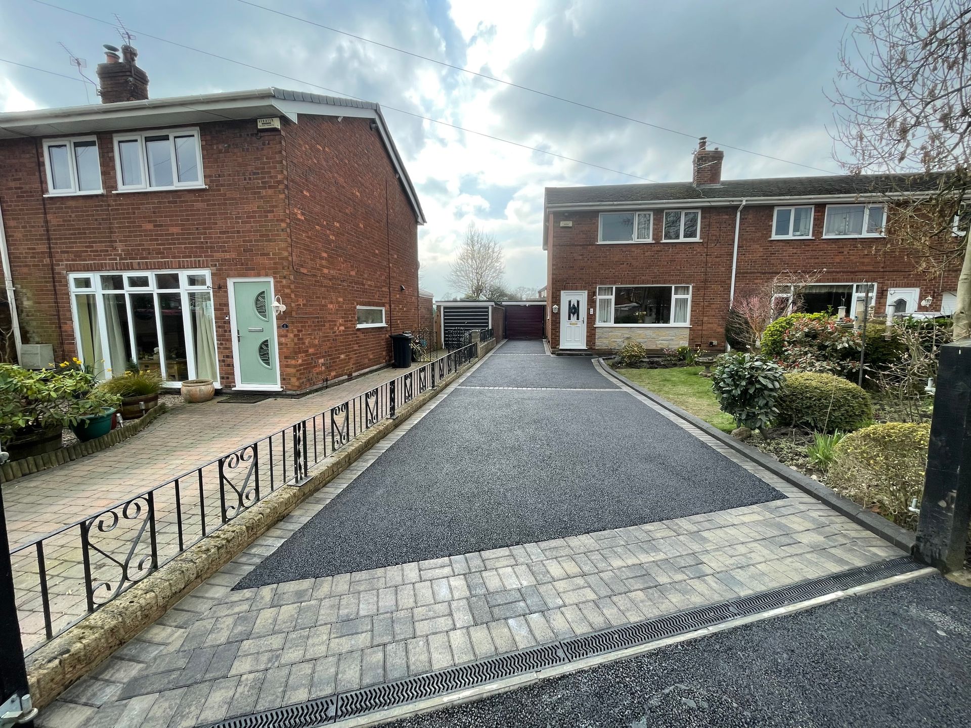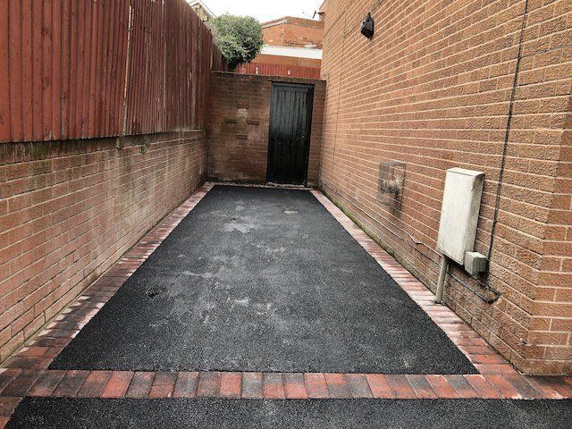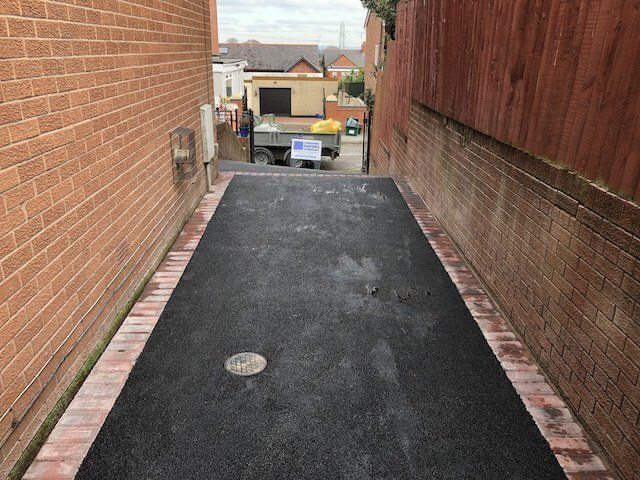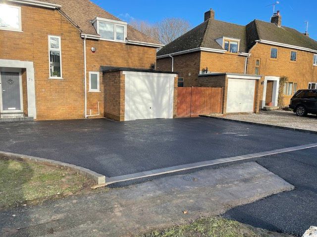 Before and after: A New Driveway Completed In Runcorn Cheshire. This Driveway Is Finished In 10mm SMA Tarmac With Tobermore Pedesta Heather Block Paved Borders, Heather Kerbstones Edging Kerbs & Recess Manhole Covers, Linear Drainage Channels. Full Dig Out, Mot Type 1 Hardcore Sub Base & Geo Tex Membrane.