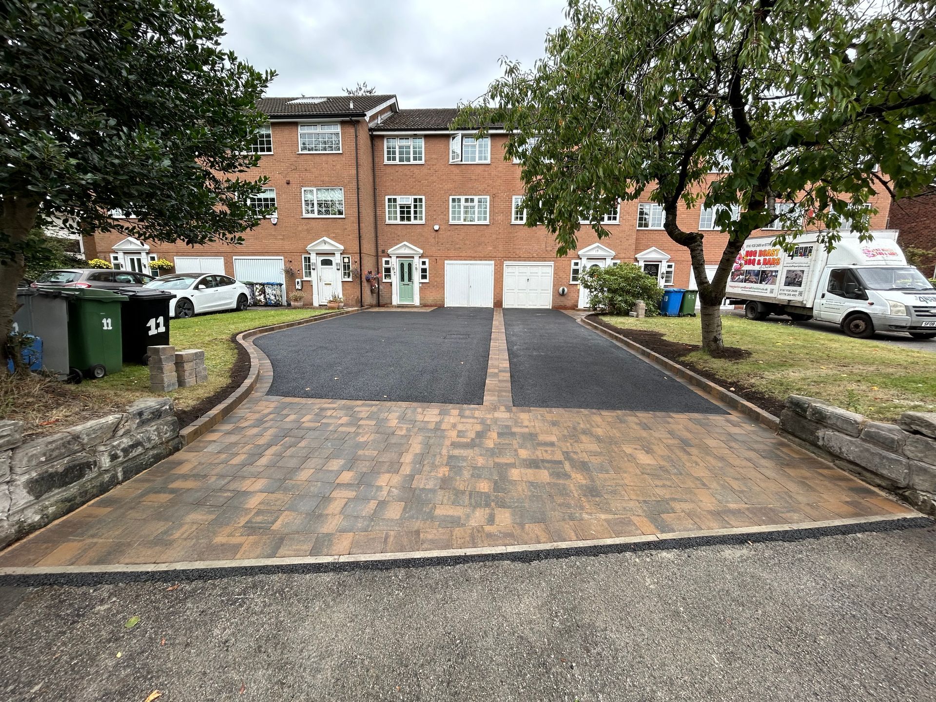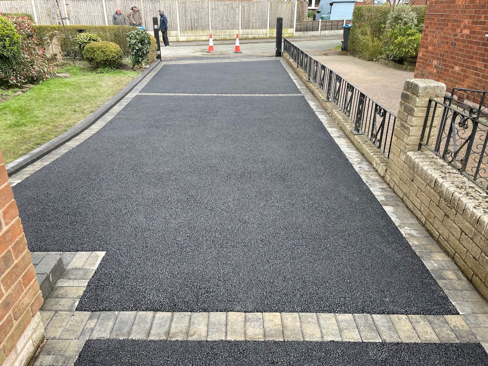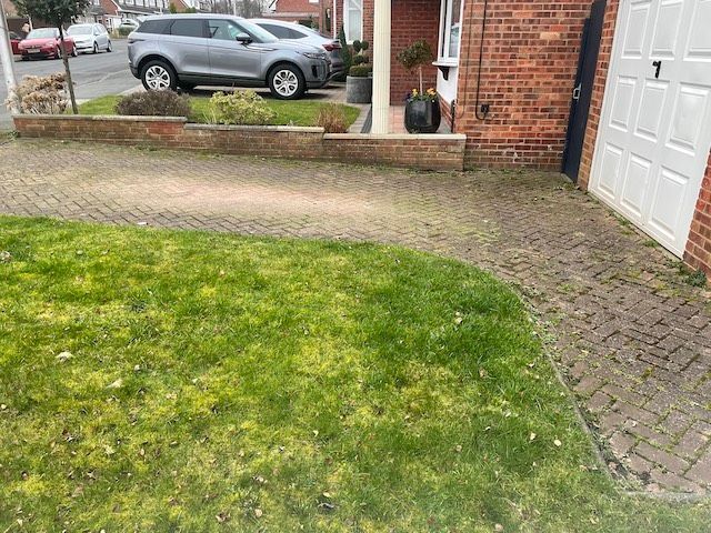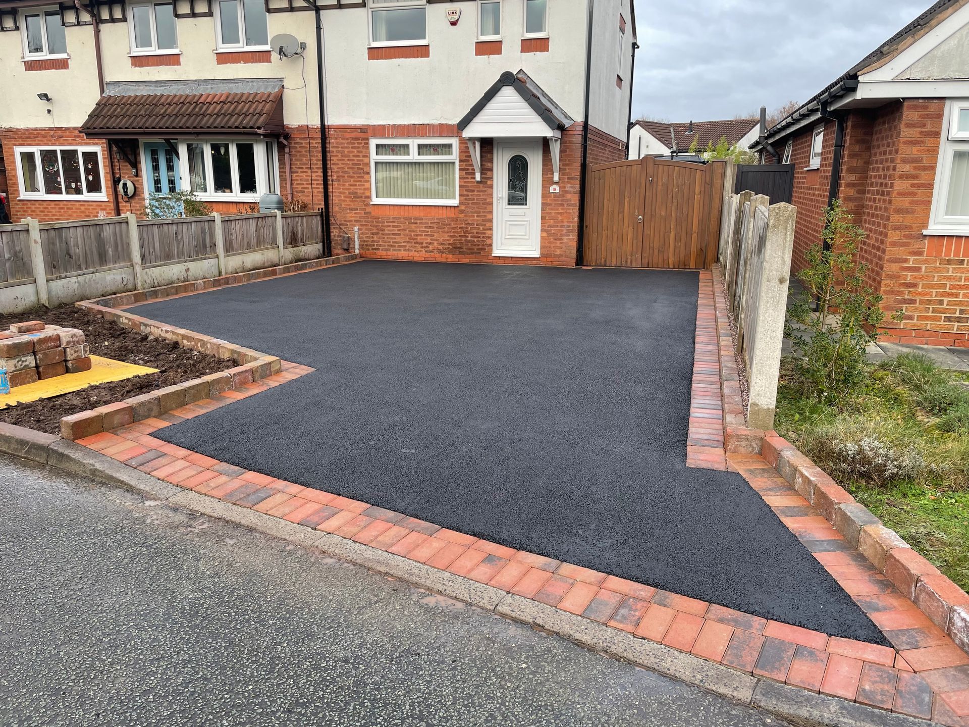 Before and after: A New Driveway Completed In Runcorn Cheshire. This Driveway Is Finished In 10mm SMA Tarmac With Tobermore Pedesta Heather Block Paved Borders, Heather Kerbstones Edging Kerbs & Recess Manhole Covers, Linear Drainage Channels. Full Dig Out, Mot Type 1 Hardcore Sub Base & Geo Tex Membrane.
