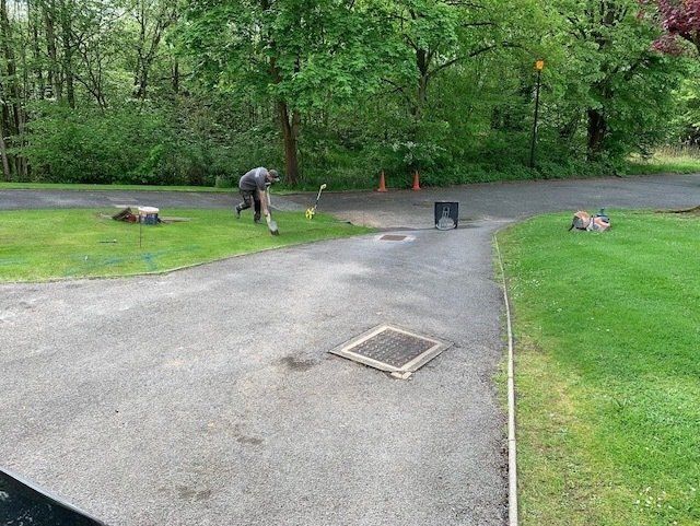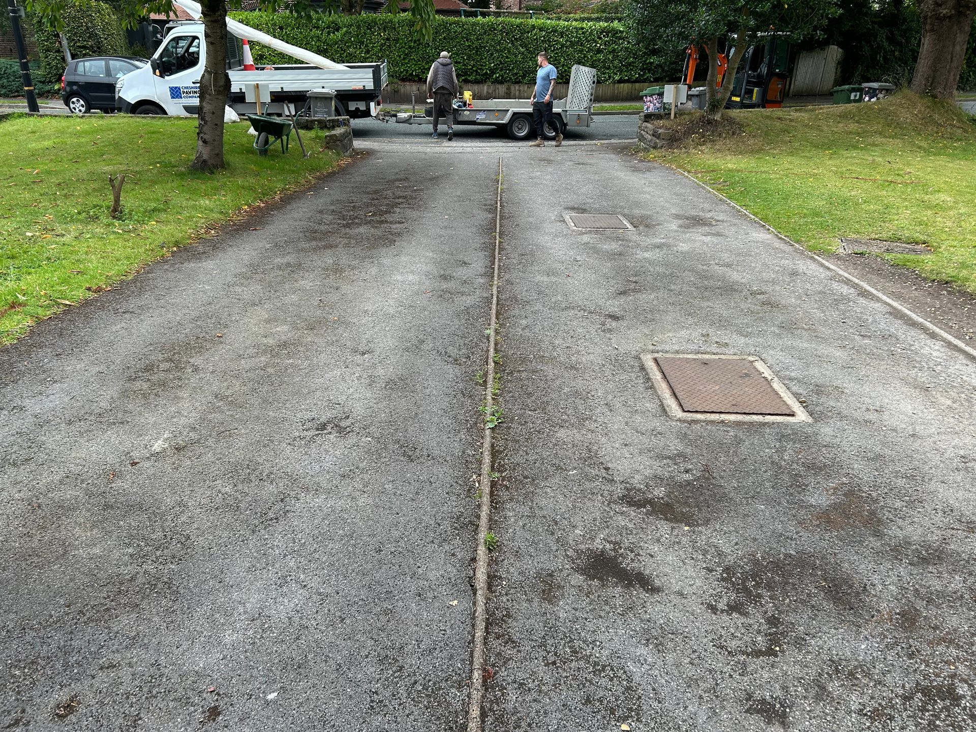 Before and after: New Double Driveway Project Completed In Timplerley Altrincham, Cheshire. This Driveway Is Finished In 10mm SMA Tarmac With Tobermore Shannon Bracken Block Paved Borders, Kerbstone Bracken Kerbs, Edging Kerbs & Recess Manhole Covers. Full Dig Out, Mot Type 1 Hardcore Sub Base & Geo Textile Membrane